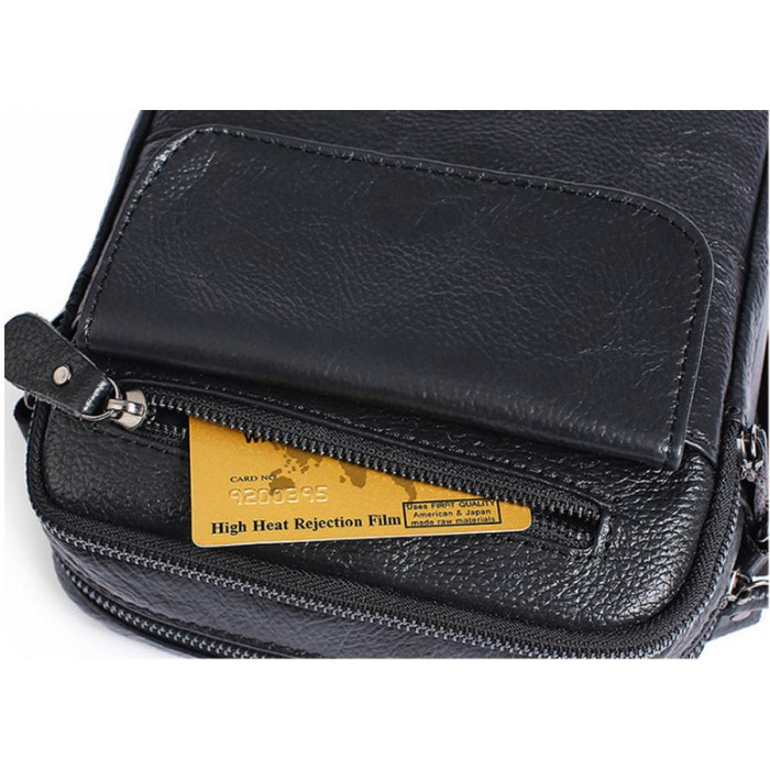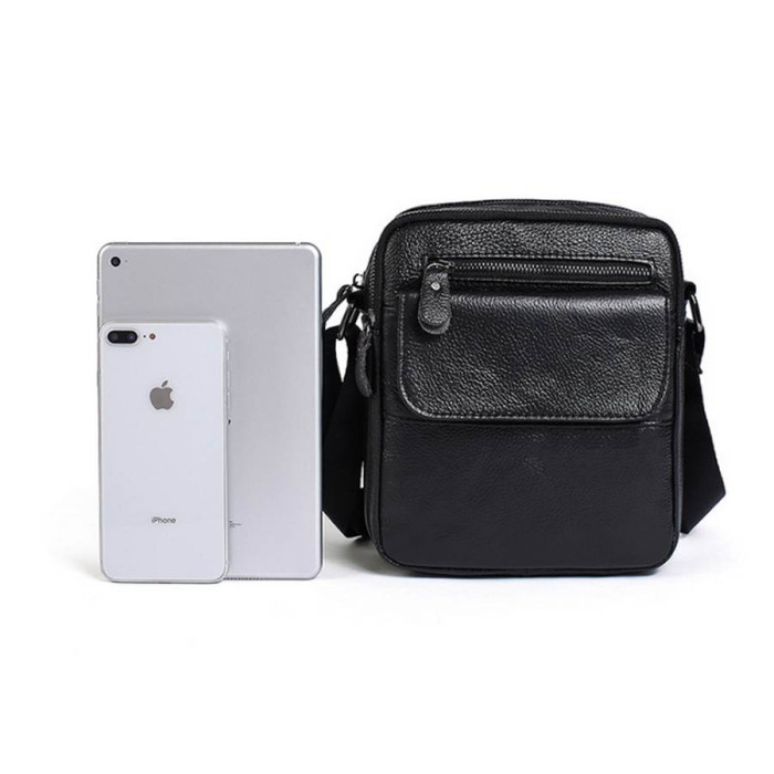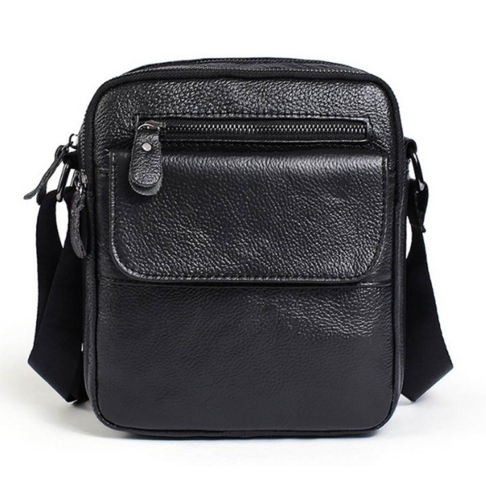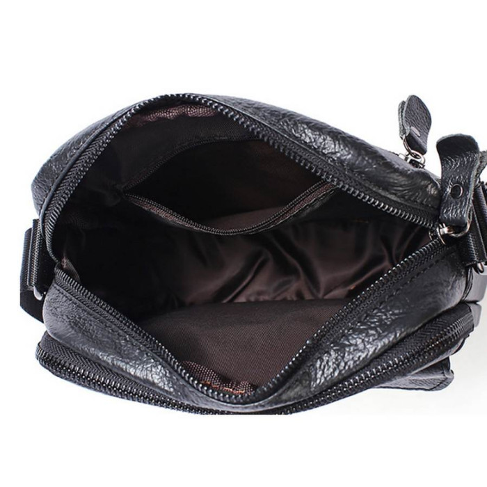 Відмінна шкіряна чоловіча сумка чорного кольору. Аксесуар носиться через плече. Підкладка виконана з надійного текстилю.