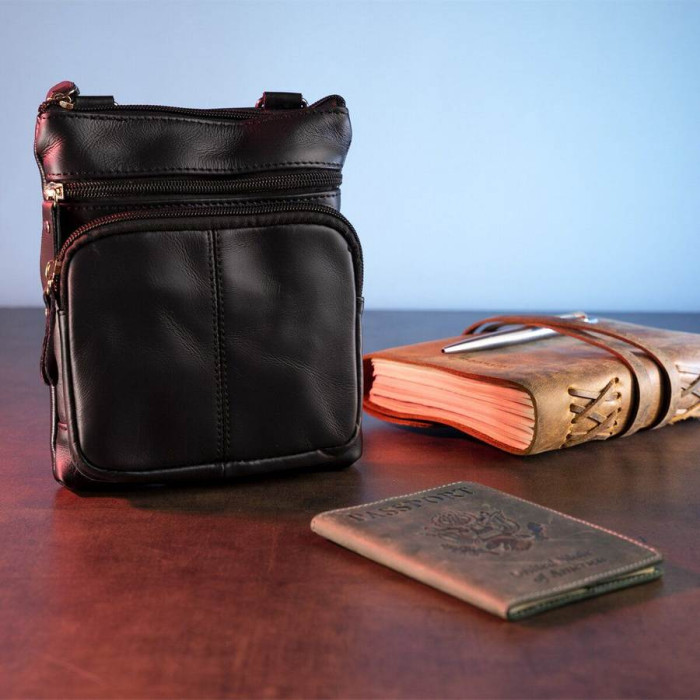 Компактна чоловіча шкіряна сумка для портмоне і документів. Відмінно підійде автомобілістам. Сумка закривається на блискавку. Підкладка виконана з міцного текстильного матеріалу. Всередині: потаємне відділення на блискавці і 2 накладні кишені для мобільних телефонів.