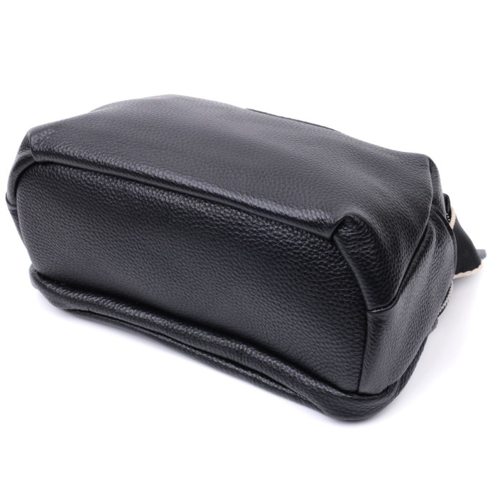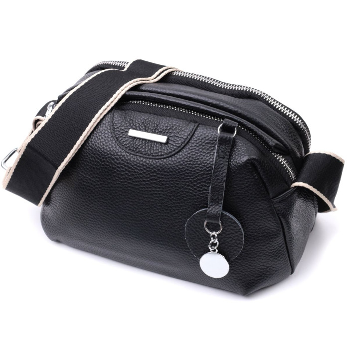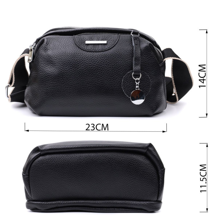Містка сумка для жінок з натуральної шкіри флотар, яка має зернисту фактуру. У виробі використано шкіру класичного чорного кольору. Аксесуар складається з двох відділень, які закриваються на блискавки, потайної кишені на блискавці та кишені відкритого типу, а також кишені зовні на тильній стороні. Виріб має тверде дно, що дозволяє зберігати форму. Носити сумку можна в руці, під рукою, на плечі і через плече, для цього є текстильний ремінь, що не знімається. В аксесуарі використано якісну фурнітуру кольору срібла. Відмінний варіант для подарунка близьким та дорогим дівчатам та жінкам.