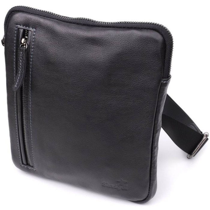 Ця чоловіча вертикальна сумка виготовлена з натуральної зернистої шкіри класичного чорного кольору. Завдяки міцній текстурі та акуратній обробці аксесуар виглядає стильно та універсально, легко поєднуючись із діловим та повсякденним чином.