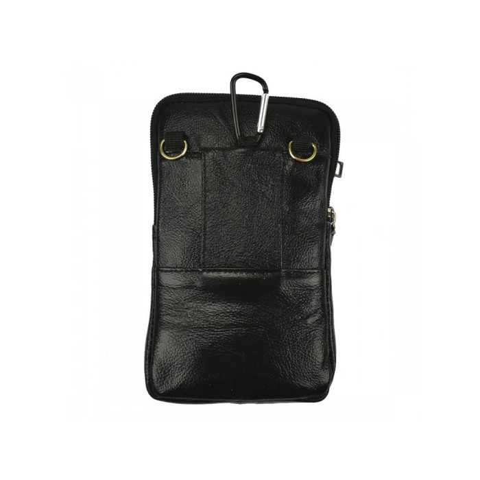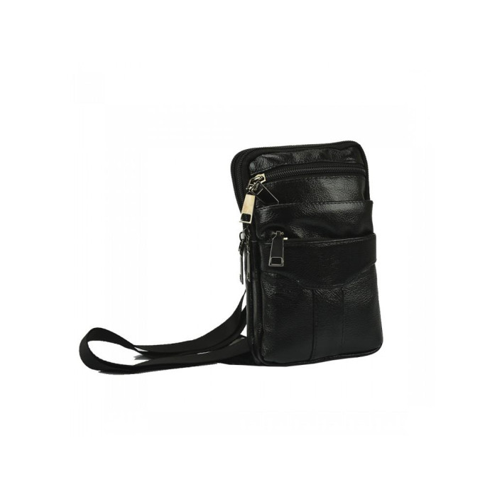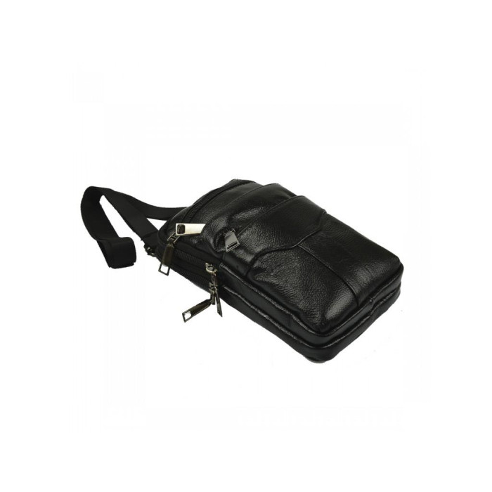 Компактна поясна сумка з натуральної шкіри чорного кольору. Для носіння додатково можна застосувати плечовий ремінь. Два відділення закриваються на блискавку. З лицьового боку є три кишені, що закриваються на блискавку.