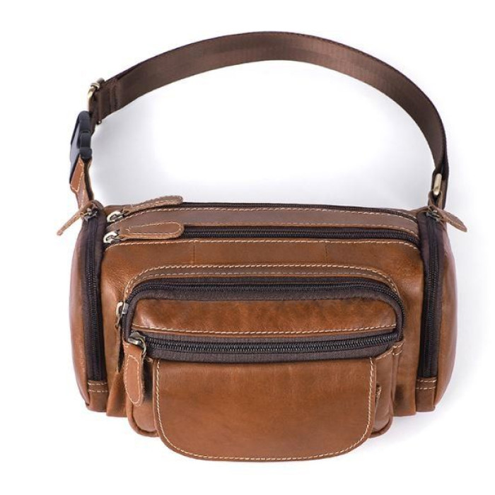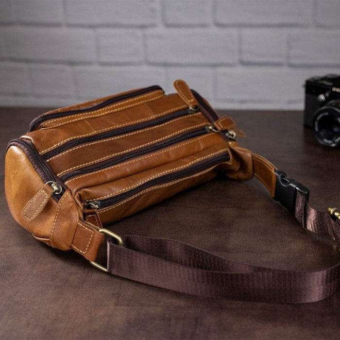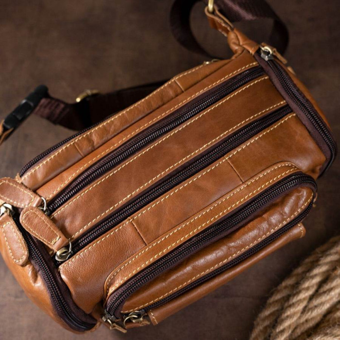 Об'ємна і містка бананка. Підійде як для чоловіків, так і для жінок. Ідеальний варіант, для тих хто носить із собою багато всякої дрібниці. Аксесуар доповнено фурнітурою золотистого кольору. Прошитий світлою ниткою по краях. З такою сумкою все найважливіше буде у вас завжди під рукою. А вкрасти сумку з пояса буде набагато складніше. Тому з такою бананка ви будете почувати себе безпечніше. Також, з нею зручно їздити в транспорті або брати її в далекі поїздки. Вам буде легко з такої сумки дістати документи або гроші при необхідності. Модель прошита рудою ниткою і доповнена фурнітурою сріблястого кольору. Буде добре виглядати в якості подарунка для близької людини.