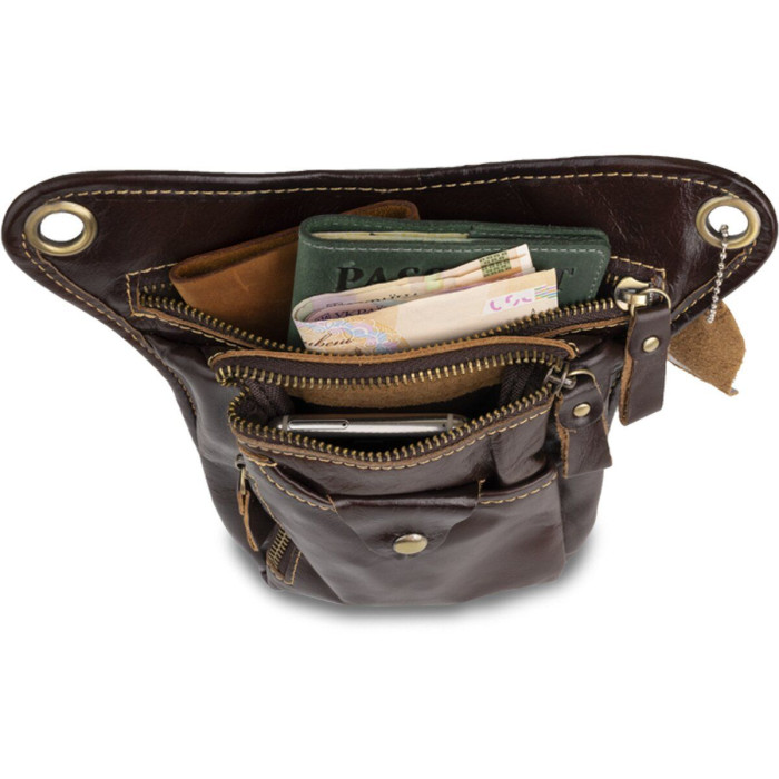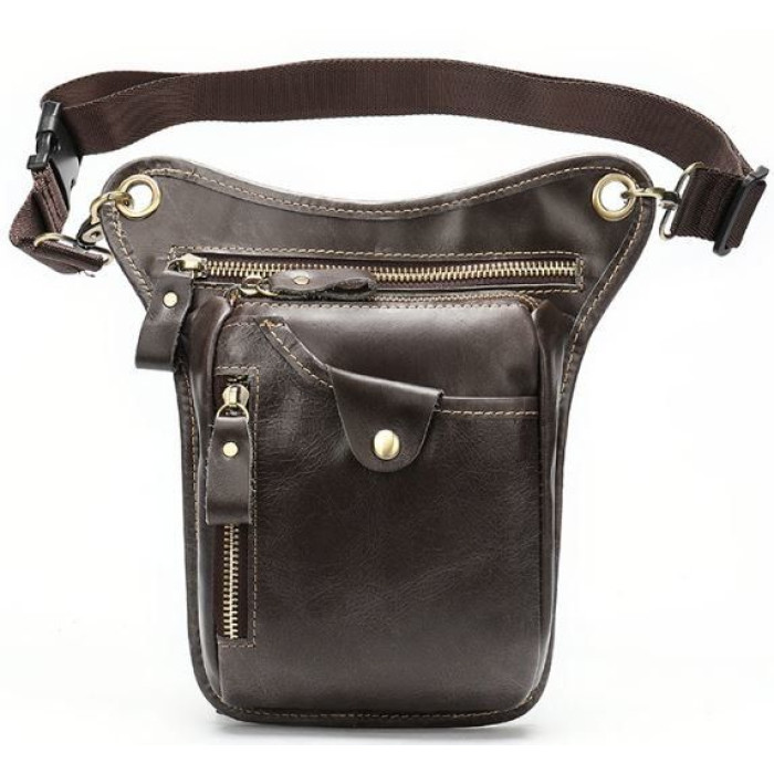 Сумка на пояс з оригінальним дизайном. Поясні сумки користуються величезною популярністю серед чоловіків. Дуже зручно мати таку сумку. Вона дуже універсальна і зручна. Все важливе буде у вас завжди під рукою. А вкрасти сумку з пояса буде набагато складніше. Тому, з такою сумкою ви бедете відчувати себе безпечніше. Також, з нею зручно їздити в транспорті або брати її на далекі поїздки. Хороший варіант - малогабаритний, але при цьому досить місткий. Вам буде легко з такої сумки дістати документи або гроші при необхідності. Модель прошита світлою ниткою і доповнена фурнітурою золотистого кольору. Вона буде добре виглядати в якості подарунка для близької людини.