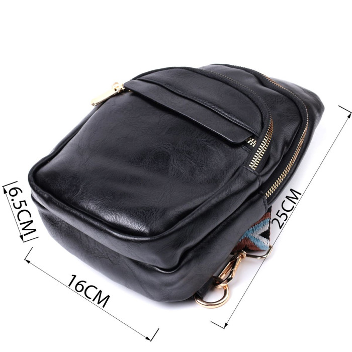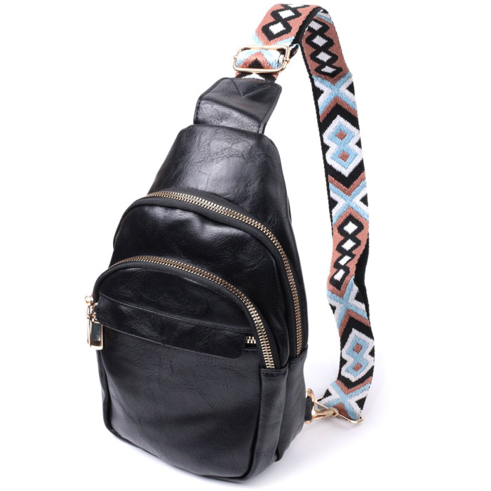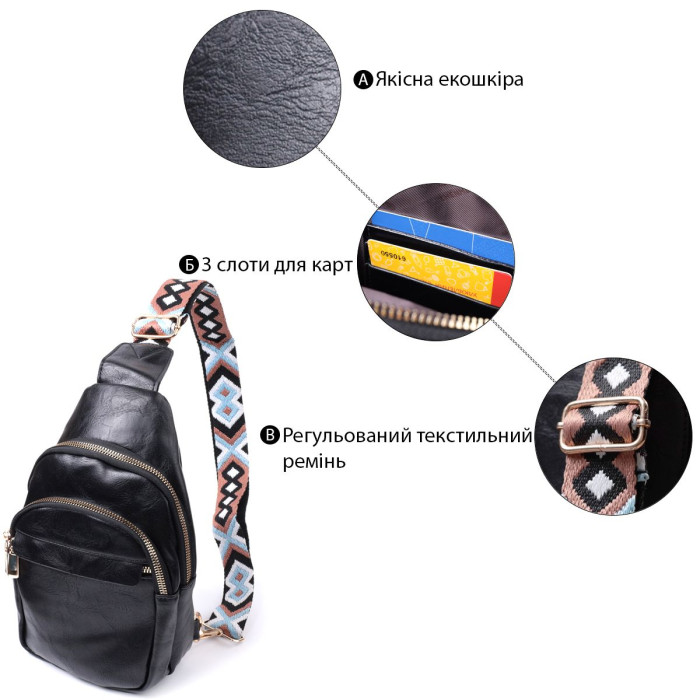 Оригінальна слінг сумка для жінок з гладкої екошкіри. Дана модель складається з одного основного відділення, яке закривається на блискавку і в якому знаходиться кишеня на блискавці і три кишені для кредитних карток усередині, а також трьох кишень зовні та одного отвору для кабелю або навушників, що дуже зручно в сучасному світі. Акцентом даної моделі є зручний регульований плечовий ремінець у етнічному стилі, що дуже модно вже кілька сезонів. Екошкіра - високоякісна альтернатива натуральному матеріалу, яка дуже стійка до тертя, до низьких температур, відмінно носиться на відміну від інших штучних матеріалів, а також має гіпоалергенний склад на відміну від натуральної шкіри.