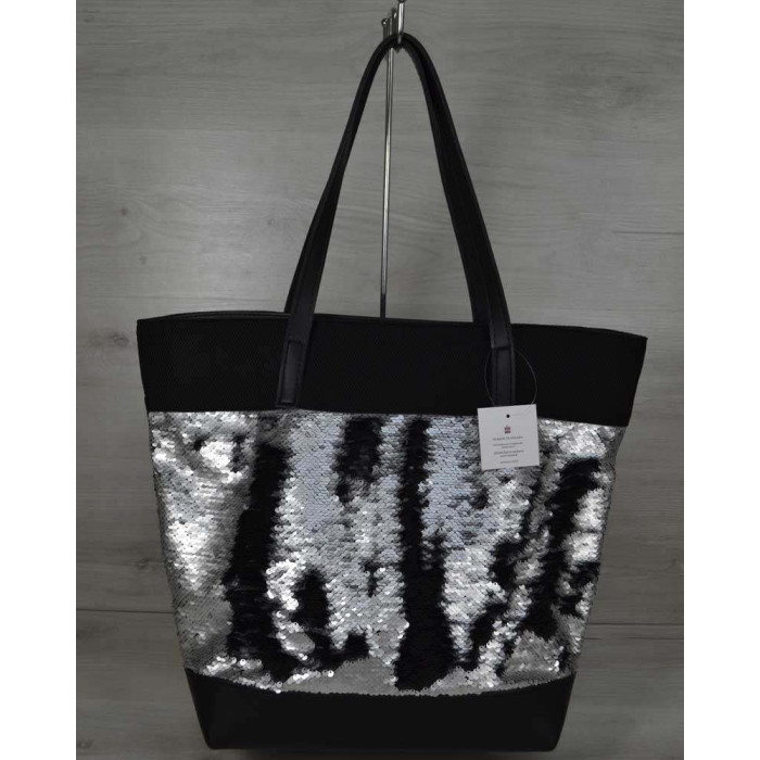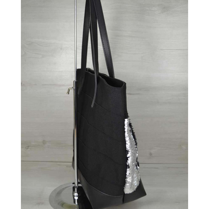 Жіноча сумка Welassie, виготовлена з гумки і шкірозамінника високої якості з паєтками. Застібається на блискавку, всередині на підкладі. Має одне відділення і дві кишені: одна на блискавці, друга відкрита, для дрібних предметів. Ручки міцні - висота їх розрахована, щоб носити сумку на згині ліктя, а також на одне плече.