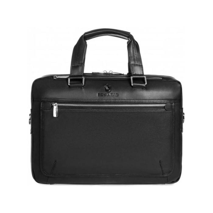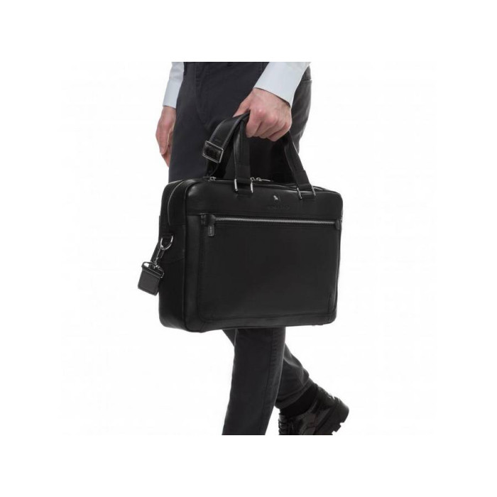 Чоловіча сумка для ноутбука з телячої шкіри. Одне основне відділення закривається на блискавку і містить відсік для ноутбука з фіксатором-липучкою. З тильного, так само, як і з лицьового боку розташоваий додатковий відсік у вигляді кишені горизонтального типу на блискавці. Анатомічні ручки виконані зі шкіри та надійно пришиті до сумки. У комплекті йде знімна наплічна шлейка з карабінами, які кріпляться до бічних петель. Сумка-портфель чудово доповнить класичний стиль одягу, ідеально поєднуючись з діловим костюмом.