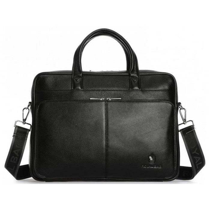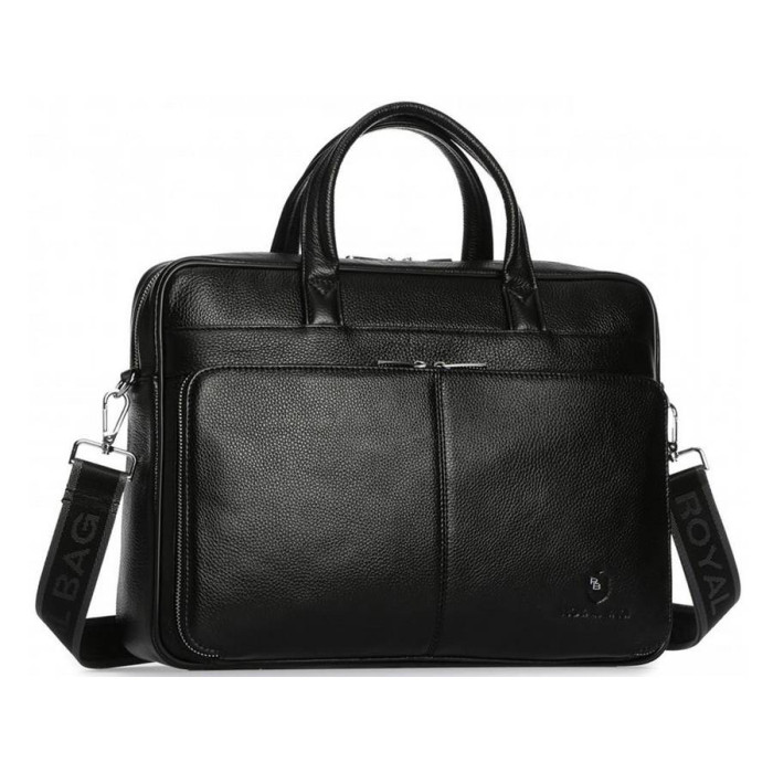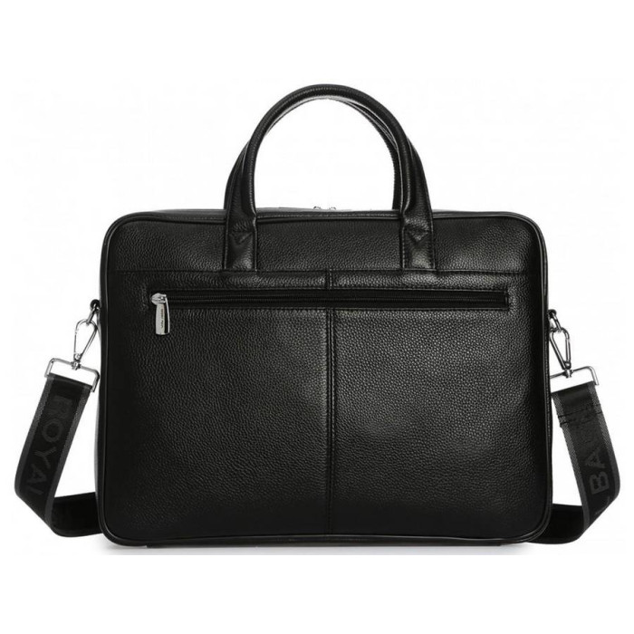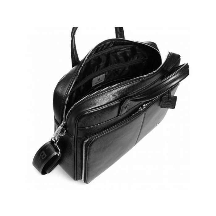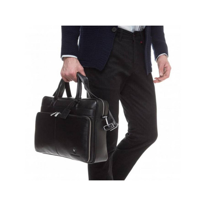 Чорна шкіряна сумка для ноутбука і документів. Зерниста текстура поверхні, надійна фурнітура сріблястого кольору. Усередині основного відділення кишені відкритого і закритого типу для канцелярії, гарнітури або особистих речей. З лицьового боку розташована накладна кишеня прямокутної форми на блискавці з двома бігунками. З тильного боку кишеня горизонтального формату. Сумку можна носити в руці або на плечі. Знімна наплічна шлейка з карабінами і регулятором довжини в комплекті.