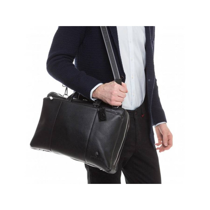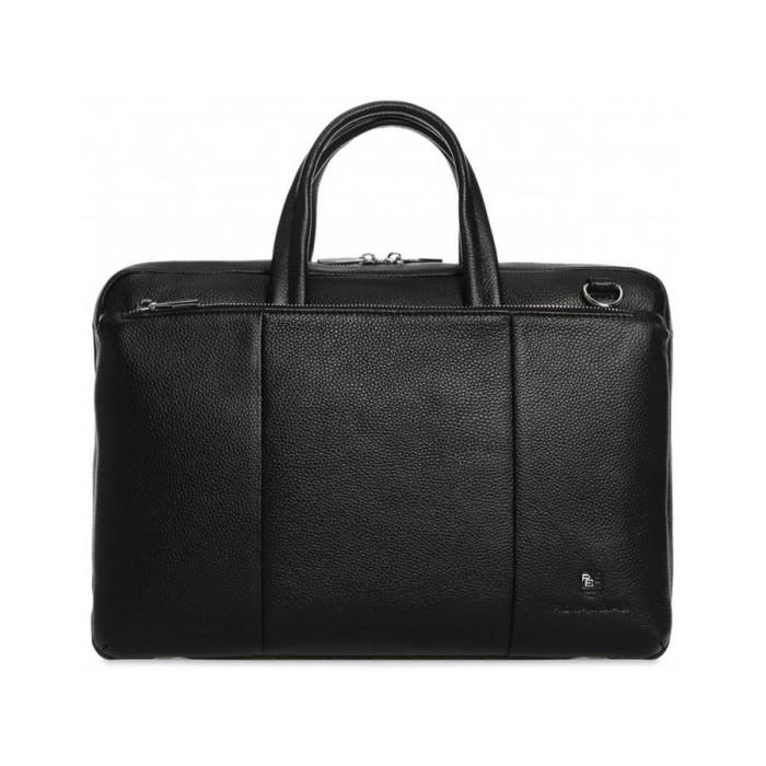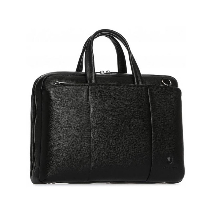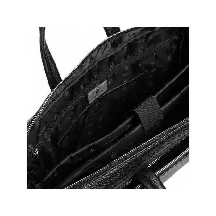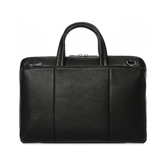 Практична і ергономічна шкіряна сумка з телячої шкіри з зернистою поверхнею. Одне основне відділення закривається на блискавку, розділене на дві частини тримачем для ноутбука і містить в собі кишені для гарнітури або канцелярії. Щільна підкладкова тканина чорного кольору. Два додаткових бічних відсіка чудово підійдуть для документів і особистих речей. Надійна металева фурнітура сріблястого кольору. Два варіанти носіння - в руці або на плечі. Знімний ремінь через плече йде в комплекті, він кріпиться на карабіни і регулюється по довжині.