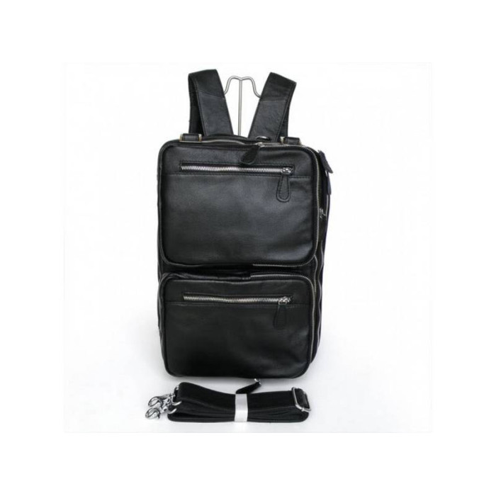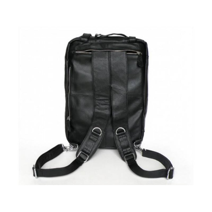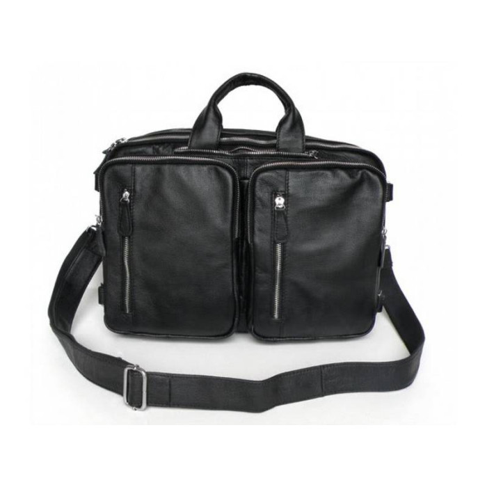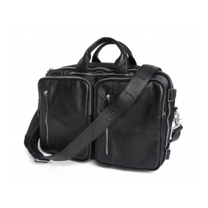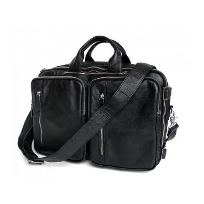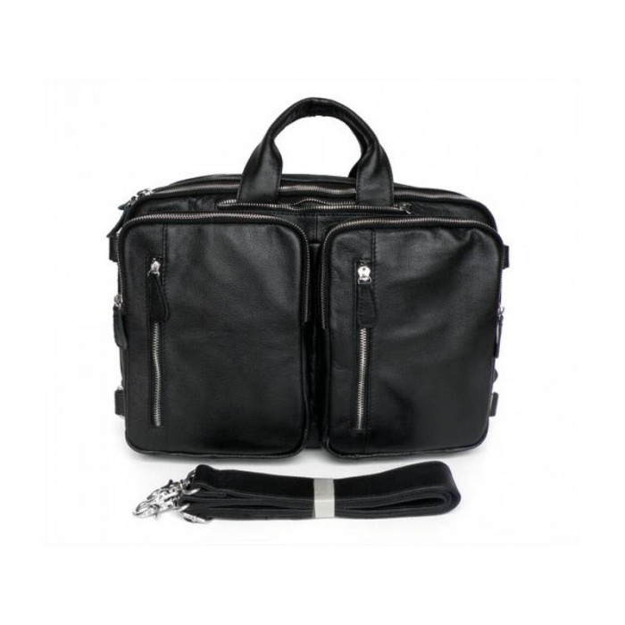 Чоловіча сумка Jasper & Maine пошита з натуральної шкіри чорного кольору. Це незвичайний сучасний аксесуар, який поєднує в собі і сумку, і рюкзак. У кишенях верхньої частини вироби сховані короткі ручки сумки, а в кишені ззаду знаходяться знімні шлейки рюкзака. Дана модель дозволить вам, не змінюючи аксесуар, виглядати зовсім по-новому. З лицьового боку є прямокутні кишені на блискавках, куди можна покласти засоби гігієни, аксесуари до гаджетів. В основні відділення поміститься ноутбук, папки з документами, портмоне. Шлейки рюкзака і знімний довгий ремінь для носіння сумки на плечі регулюються по довжині.