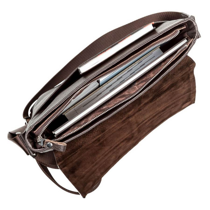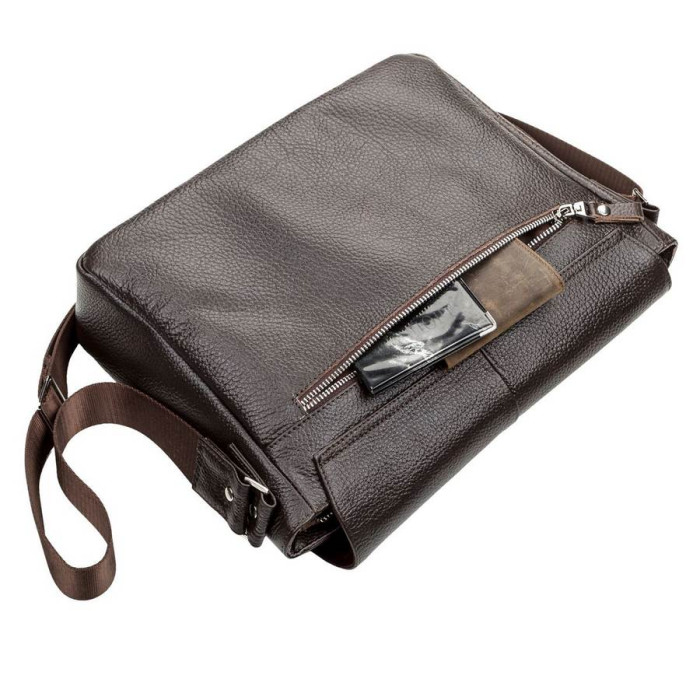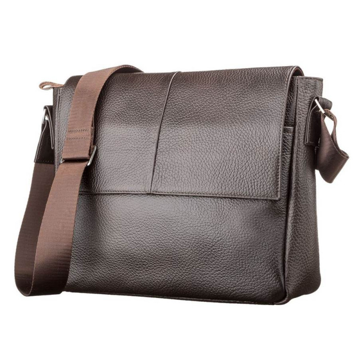 Оригінальна коричнева сумка з натуральної шкіри, яка сподобається Вам своїм стильним виглядом. Сумка виготовлена в чорно-коричневому кольорі і доповнена міцним текстильним чорним ременем, який регулюється і дозволяє носити виріб на плечі або через плече.