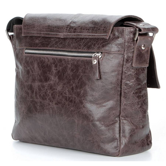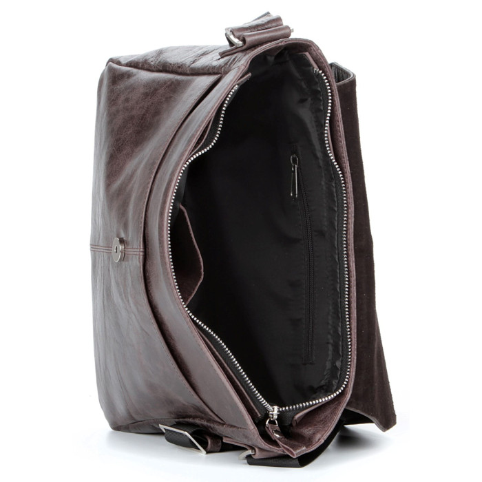 Ця сумка виготовлена з міцної шкіри і доповнена надійною металевою фурнітурою. Просторе внутрішнє відділення, що закривається блискавкою і клапаном, надійно збереже всередині всі Ваші речі. Для більшої міцності і стійкості дно сумки ущільнено.
