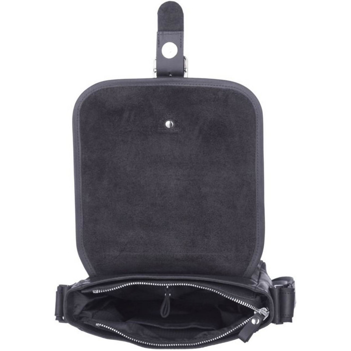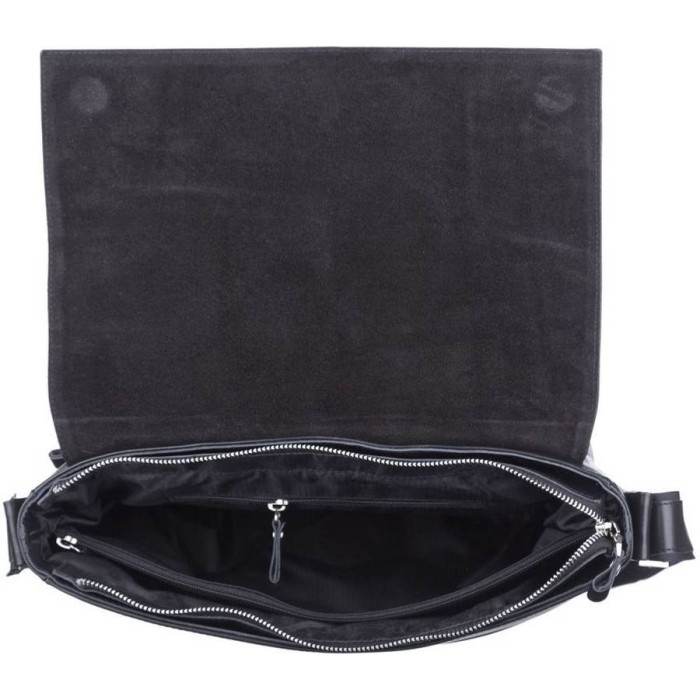 Ззаду на сумці розташований прорізна кишеня для дрібних речей. Закривається дана модель клапаном, обшитим по контуру міцною ниткою з декоративною пряжкою на магнітній кнопці.