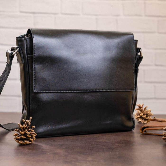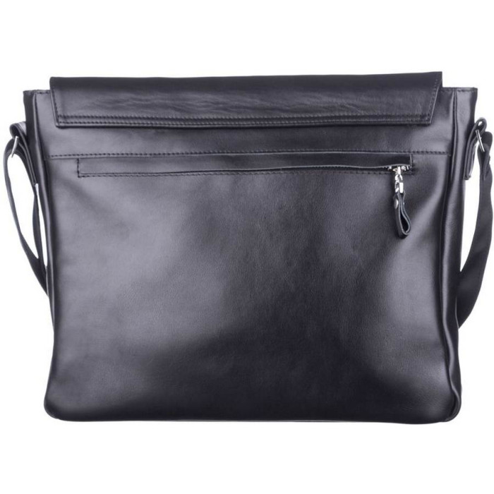 На задній стінці є прихована кишеня на застібці, яка прикривається шкірою. Закривається сумка з допомогою клапана з магнітами. При відкритті глибока накладна кишеня.