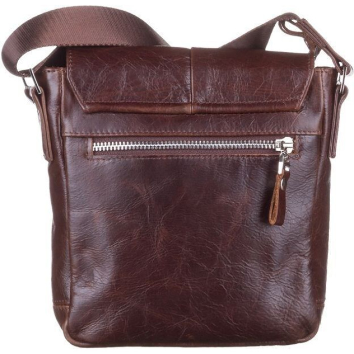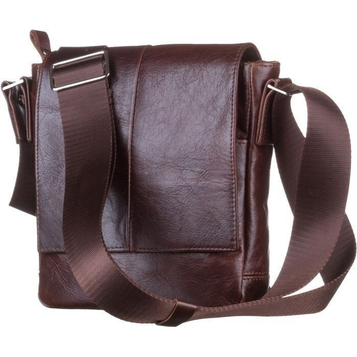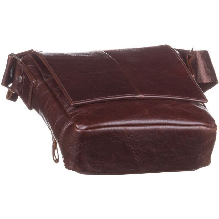 Невелика чоловіча шкіряна сумка через плече українського виробництва. Виріб виконаний з гладкої шкіри, високої якості. Колір фурнітури: срібло. Аксесуар закривається за допомогою клапана на двох прихованих магнітах і металевою блискавкою. Під клапаном розташована накладна кишеня. На задній зовнішній стороні даного аксесуара знаходиться відділення на металевій блискавці. Сумка носитися через плече за допомогою регульованого текстильного плечового ременя. Відмінне рішення для подарунка чоловікові будь-якого віку.