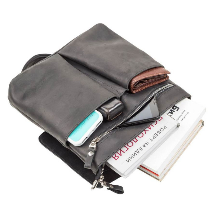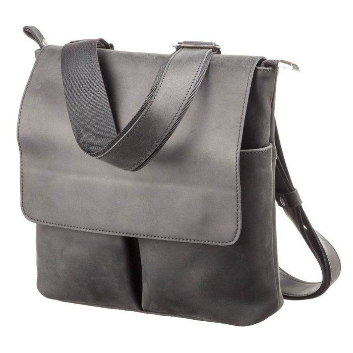 Сумка середніх розмірів з натуральної вінтажної шкіри для чоловіків, які щодня носять з собою багато дрібних речей (ключі, телефон, блокнот, портмоне, невеликий планшет, і т.д.). Аксесуар досить вмісткий для своїх розмірів, закривається за допомогою клапана на магнітах, для додаткового захисту речей на блискавку.