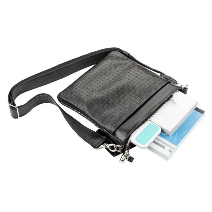 Стильна шкіряна сумка з натуральної гладкої шкіри, з елементами тиснення під "плетіння ". Аксесуар обладнаний надійною металевою фурнітурою під срібло. Внутрішня підкладка: якісний, міцний текстиль.