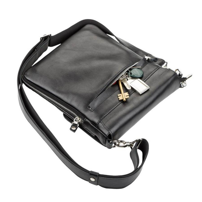 Закривається аксесуар клапаном на двох магнітах. При відкритті є добротна накладна кишеня. Головне відділення закривається блискавкою, для додаткового захисту особистих речей.Всередині на задній стінці розташована прихована кишеняна змійці, на передній стінці нашитий для габаритного смартфона або портмоне.