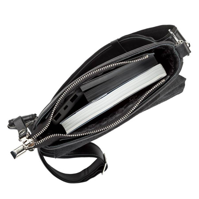 На задній, зовнішньої, стінці аксесуара розташована прорізна кишеня на застібці, яка прикрита шкірою. Обсяг сумки збільшується за допомогою блискавки на її гранях.
