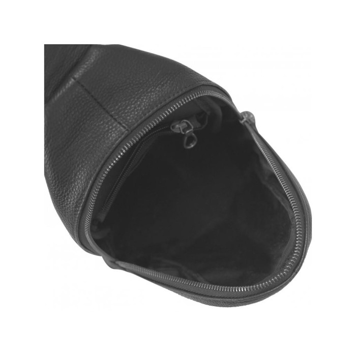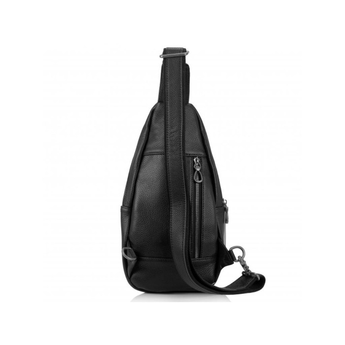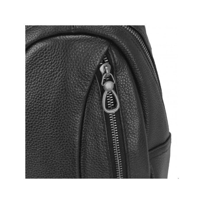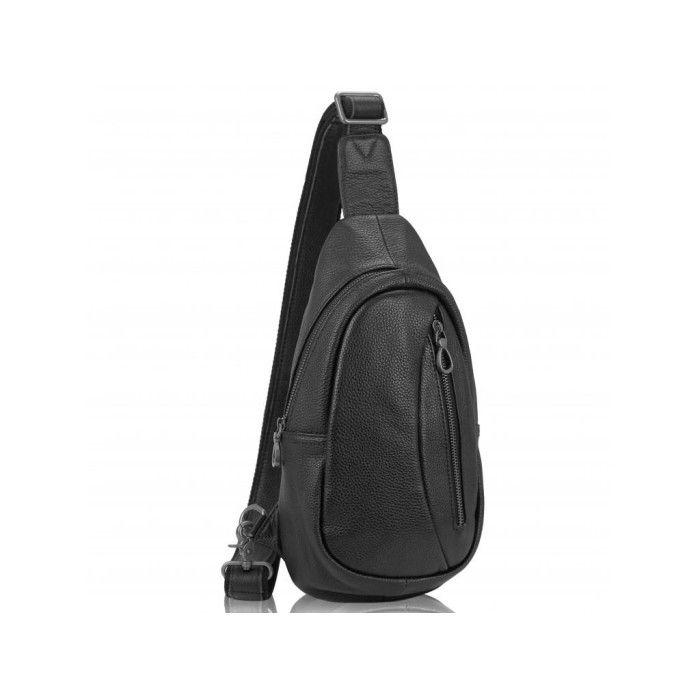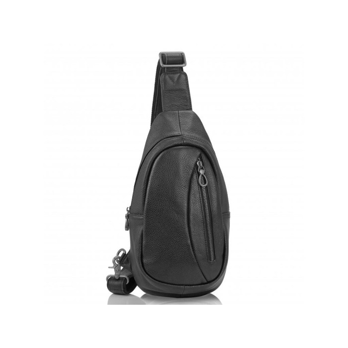 Шкіряний чоловічий слінг чорного кольору. Оснащений якісною фурнітурою, і щільним плечовим ременем. Складається рюкзак з одного основного відділення, з лицьової і тильної сторони є по одномій кишені на блискавці вертикального типу. Усередині сумки-слінгу кишеня на блискавці і кишеня відкритого типу.