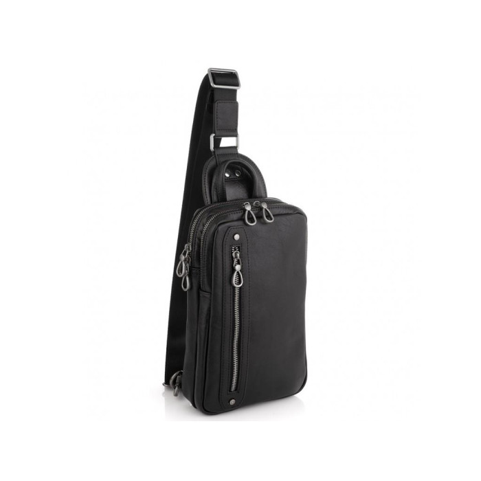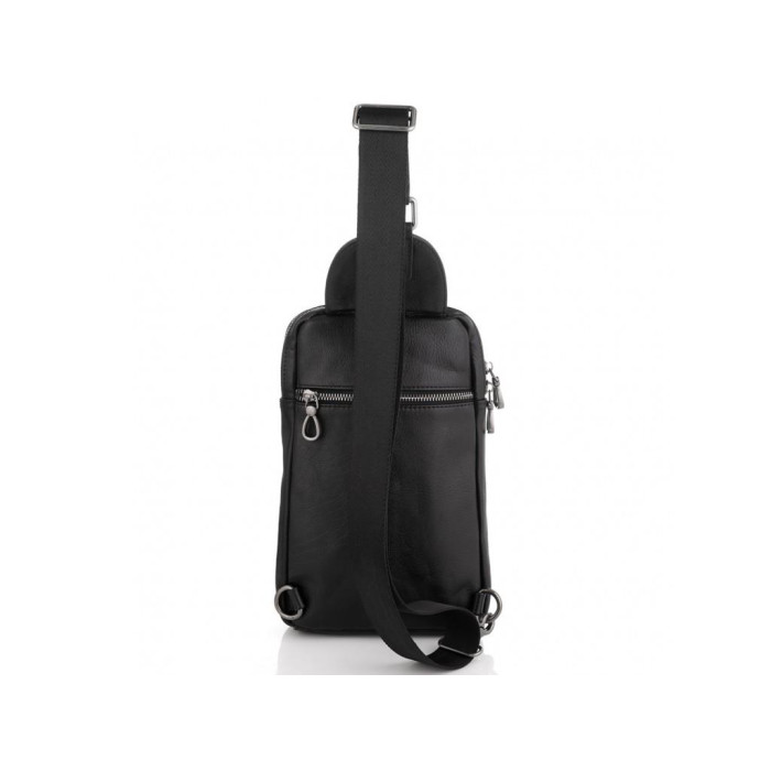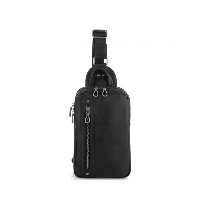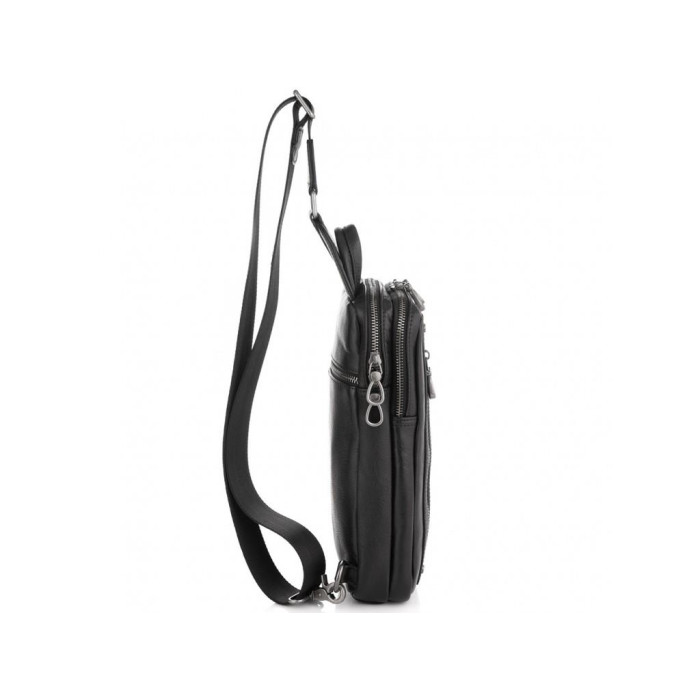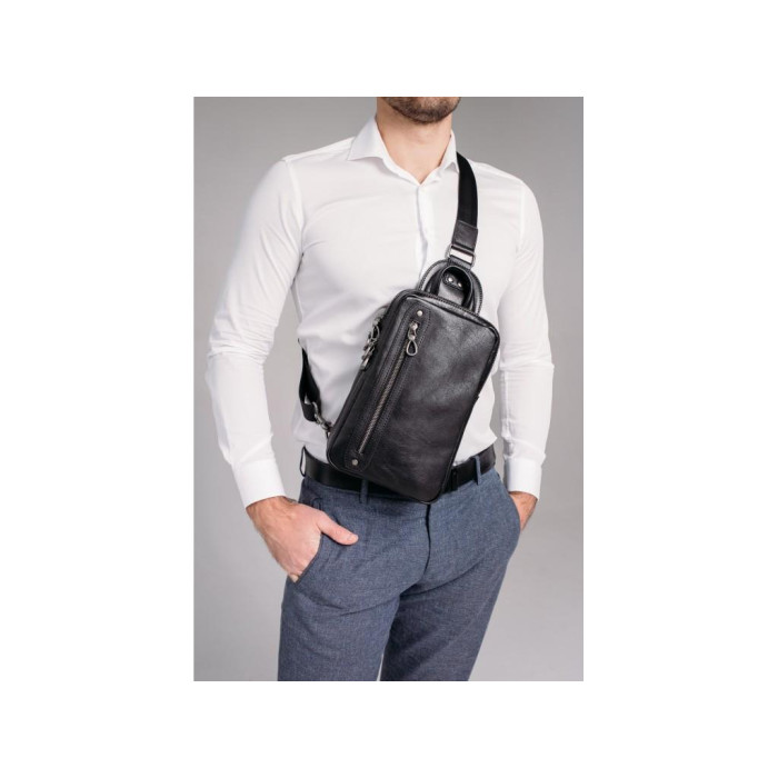 Сумка-слінг через плече в чорному кольорі. Плечовий ремінь текстильний регулюється по довжині. Сумка має два основних відділення. З лицьового боку є кишеня на блискавці вертикального типу, з тильного боку також кишеня на блискавці. Всередині першого відділення є кишеня на блискавці, всередині другого відділення кишеня відкритого типу для дрібниць.