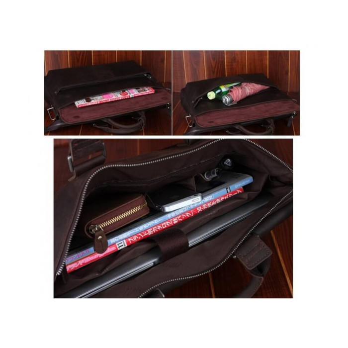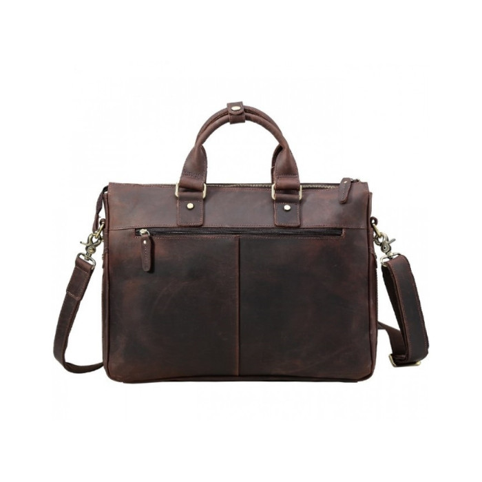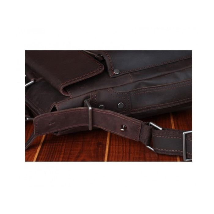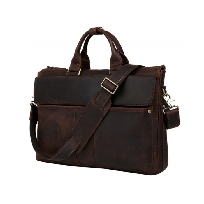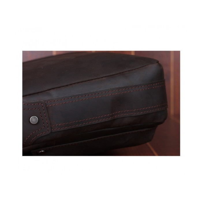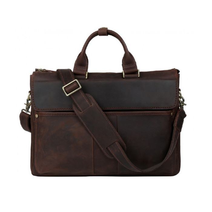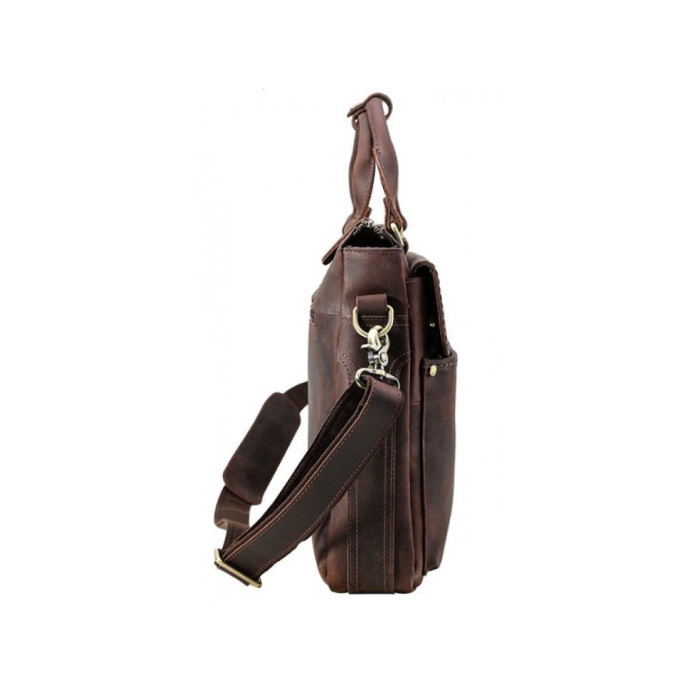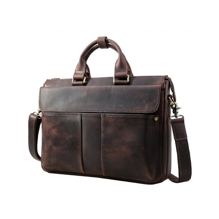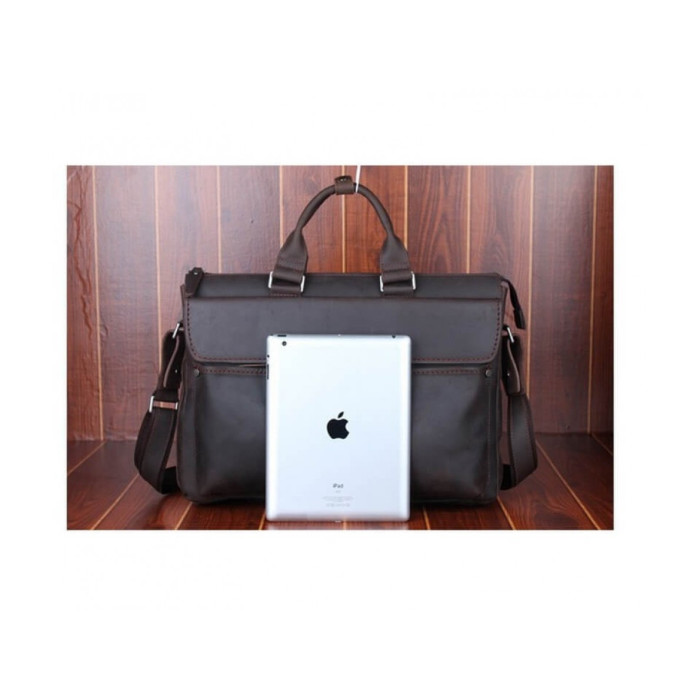 Чоловіча сумка стилю кежуал (casual) виготовлена з товстої натуральної шкіри коричневого кольору. Поверхня має ефект потертості. Аристократичні лінії правильної геометричної форми підкреслені швами, виконаними товстою ниткою в тон сумки. Для носіння можна використовувати короткі ручки із застібкою або ремінь через плече, який можна при бажанні відстібнути. На ремені є наплічна підкладка зі шкіри. У виробництві сумки використовується якісна металева фурнітура. З тильного боку є кишеня на блискавці. З переднього боку під клапаном розташований додатковий відділ, який підійде для зберігання гаманця, телефону, ключів. В основному відділі передбачено відділ під ноутбук, який застібається на ліпучку і кілька кишень-органайзерів.