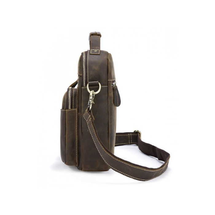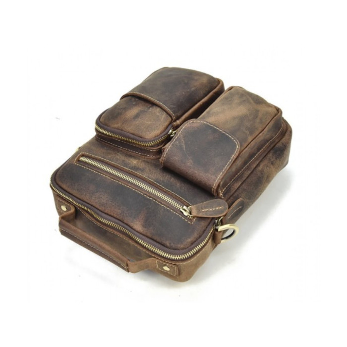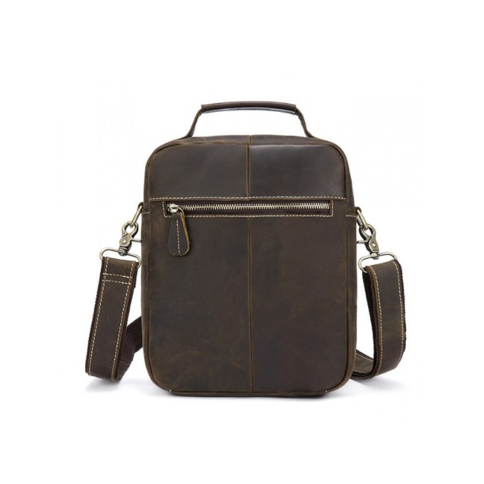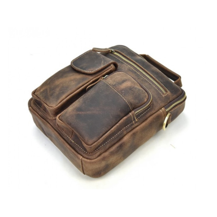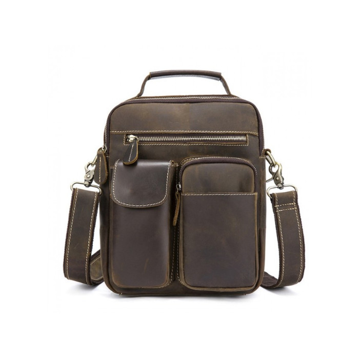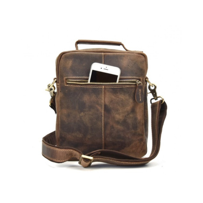 Сумка-планшетка виготовлена з міцної кінської шкіри коричневого кольору в стилі кежуал (casual). Поверхня має вигляд легкої потертості, що надає їй вінтажний стиль. Модель підходить для повсякденного і ділового одягу. При виготовленні використовувалася надійна металева фурнітура і міцна підкладкова тканина. Спереду є один відділ на блискавці і дві накладних кишені, які ідеально підходять для зберігання гарнітури або окулярів. З тильного боку розташований горизонтальний відділ, що закривається на блискавку. Основний відсік також закривається на металеву змійку. Всередині є потайна кишеня і кишені-органайзери. Для носіння використовується ручка або плечовий ремінь, який при бажанні можна відстебнути