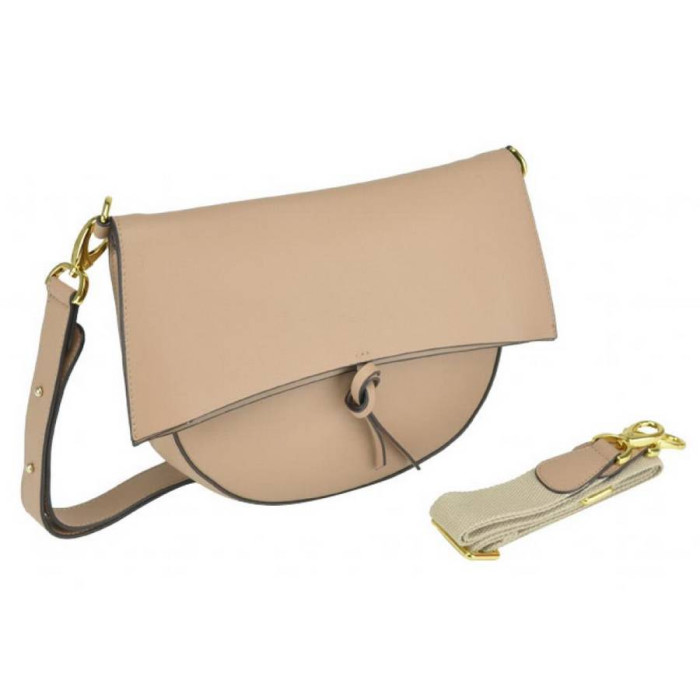 Оригінальна жіноча сумка від компанії UnaBorsetta виготовлена зі шкіри молодого теляти. Закривається дана модель клапаном з вигином на двох магнітних кнопках. Всередині є додаткове відділення закритого типу для дрібних предметів. З тильного боку також передбачена кишеня на блискавці для швидкого доступу. Носити сумку можна на плечі або через плече за допомогою текстильного ременя, який регулюється по довжині, а в потрібний момент відстібається для носки сумки в руці. Цей аксесуар може вміщати в себе гаманець невеликого розміру, смартфон і документи.