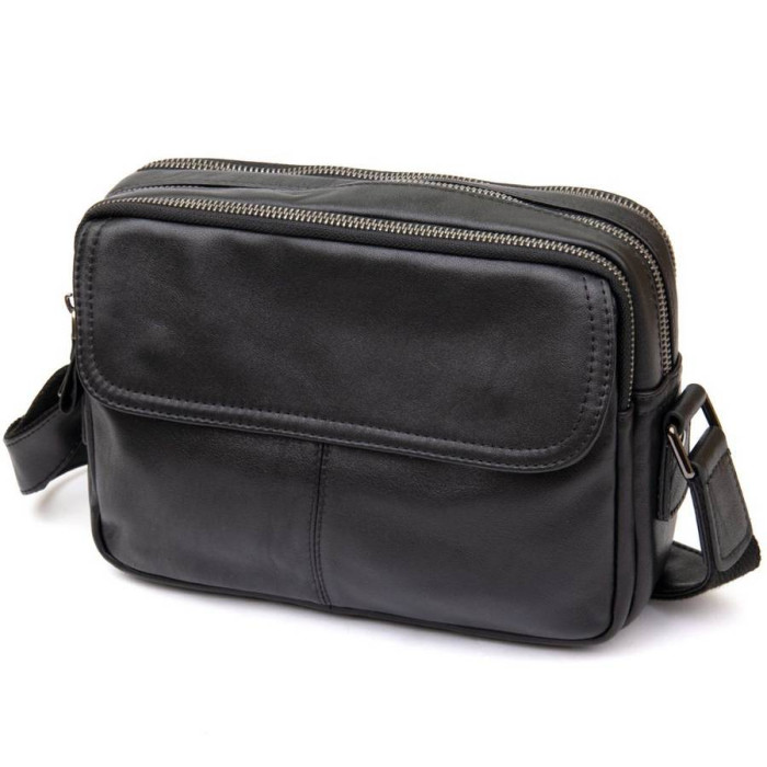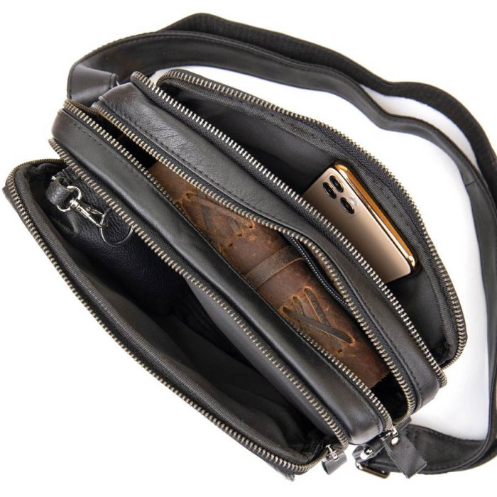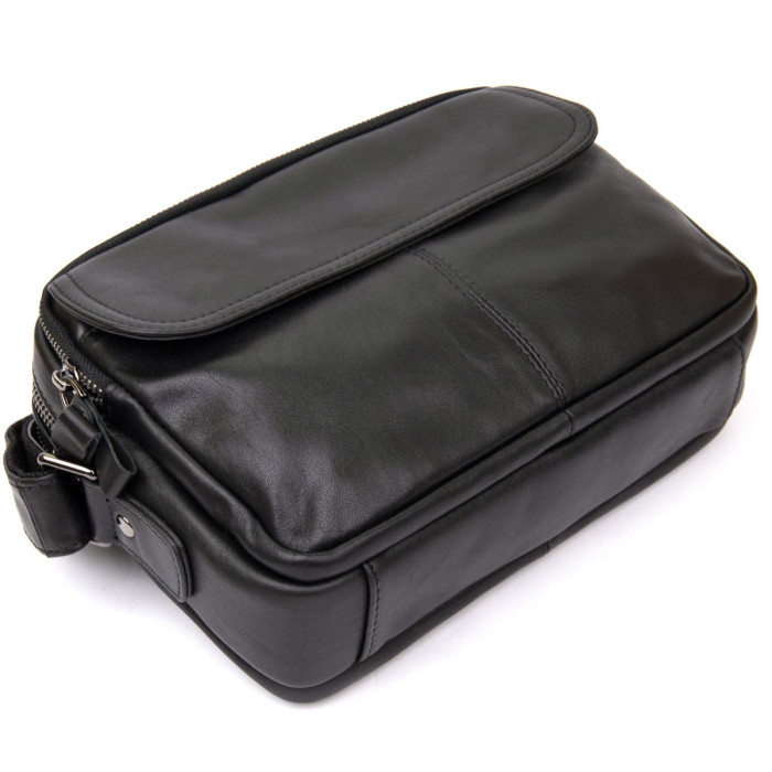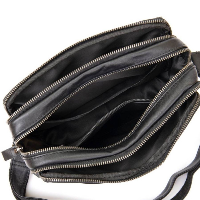 Відмінна чоловіча сумка чорного кольору. Аксесуар виконаний з натуральної високоякісної шкіри, яка відрізняється легким, ледь помітним блиском. Колір фурнітури: темне срібло. На лицевій стороні розташована невелика кишеня під клапаном на магнітах. На задній зовнішній стороні знаходиться вмістке відділення на блискавці. Сумка має три автономних відділення, які закриваються на блискавки, всередині одного з них знаходяться дві кишені (один з них на блискавці). Підкладка виконана з міцного текстильного матеріалу коричневого кольору.