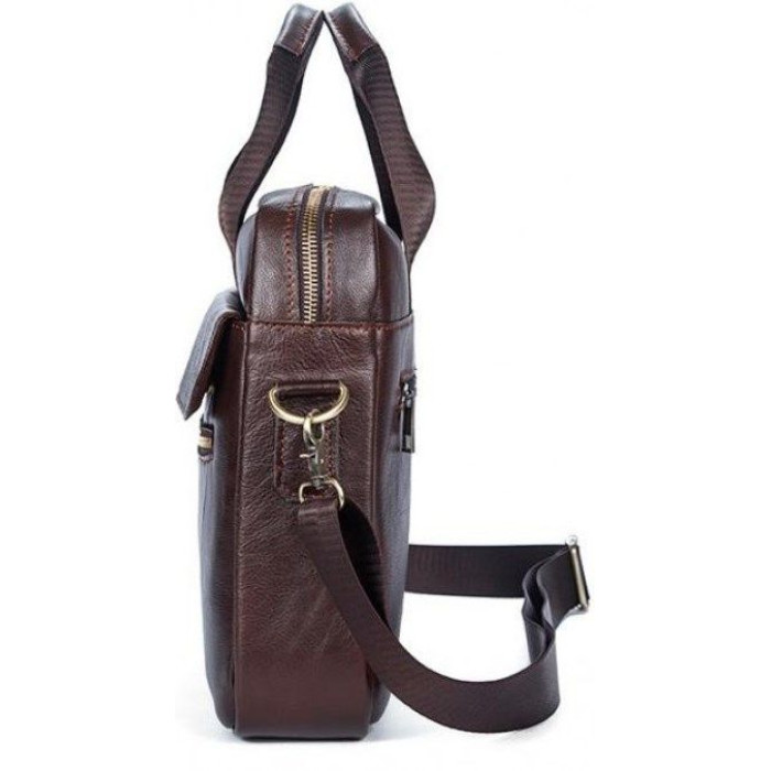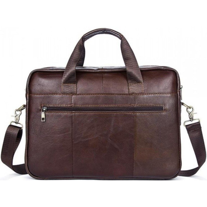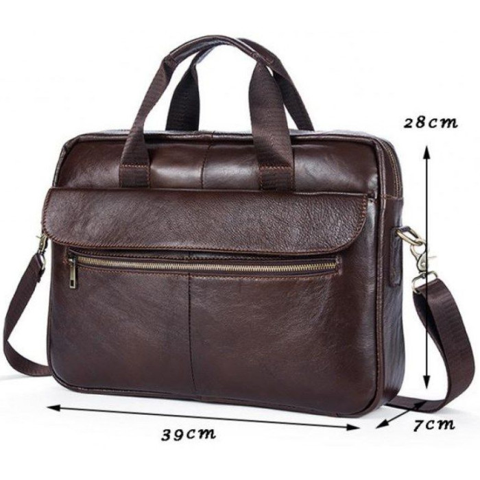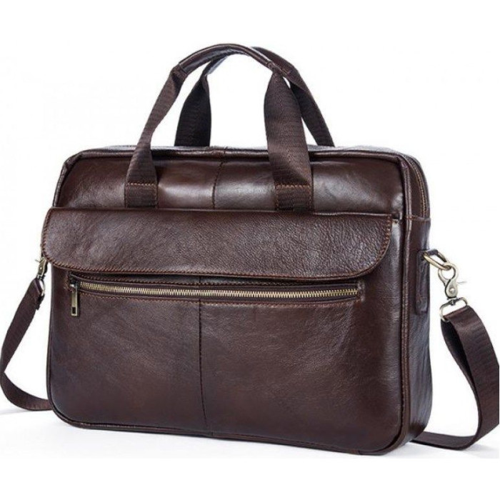 Багатофункціональна коричнева чоловіча сумка з відділенням для невеликого ноутбука 15 дюймів, а також документів формату А4. Аксесуар виконаний з натуральної зернистої шкіри коричневого кольору. На лицевій стороні даного виробу розташовані два вмістких відділення, одне під клапаном на магнітах, інше на блискавці. На задній зовнішній стороні знаходиться ще одне відділення на блискавці. Сумку можна переносити в руці за допомогою зручних шкіряно-текстильних ручок, а також через плече (в комплекті є регульований плечовий ремінь, який виконаний з текстильного матеріалу). Колір фурнітури: латунь.