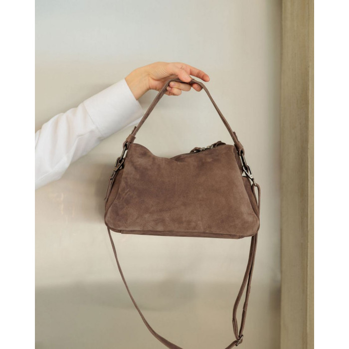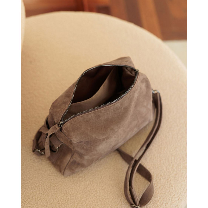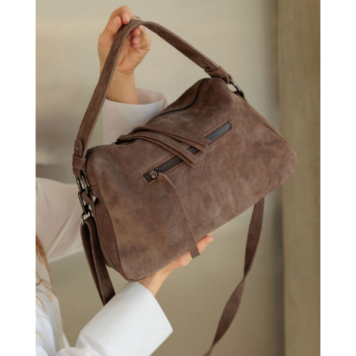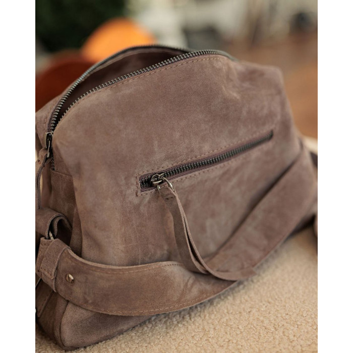 Жіноча сумка K1201, виробник Україна, колір сірий, матеріал сумки натуральна шкіра, замша. Сумка відкривається за допомогою блискавки. Усередині сумка має одну відкриту кишеню та кишеню на блискавці. Зовні є кишеня для дрібних предметів. Сумка має довгий ремінь 110 см і ручку 12 см (від верху сумки).
