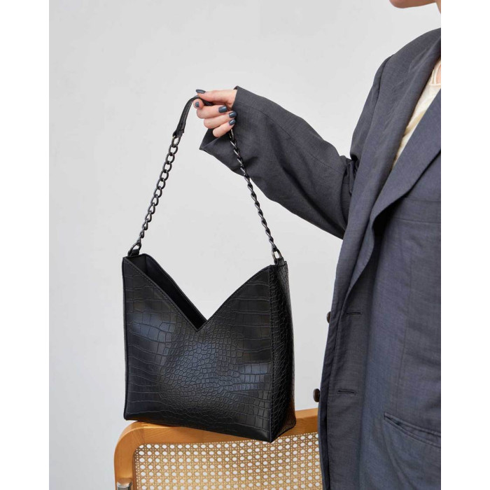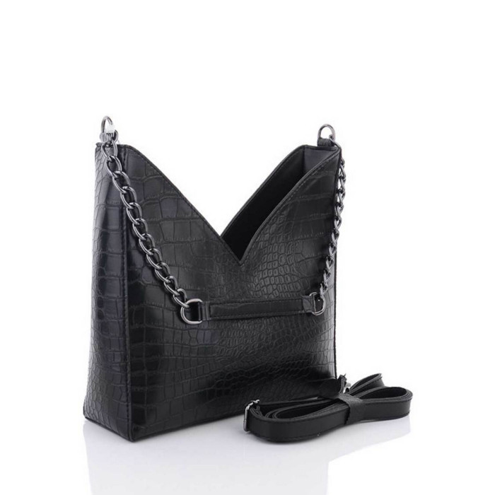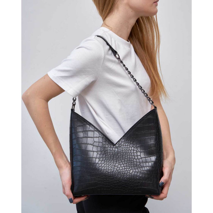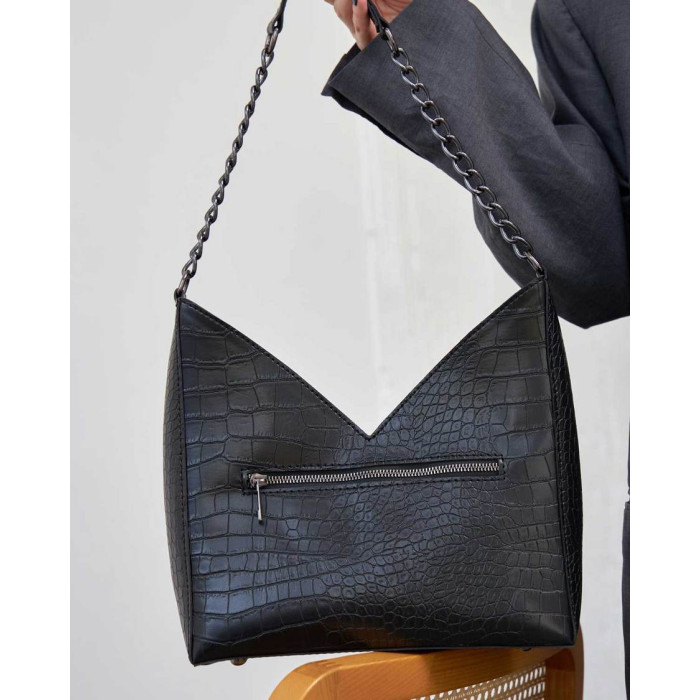 Жіноча сумка 68906 колір чорний, з екошкіри високої якості (матеріал схожий на шкіру). Сумка відкривається за допомогою блискавки. Всередині на підкладці, має дві кишені: відкрита і на блискавці. Зовні є кишеня для дрібних предметів. Ручка сумки прикрашена ланцюжком. Плечовий ремінь регулюється під різну довжину, максимальна довжина плечового ременя 115 см.