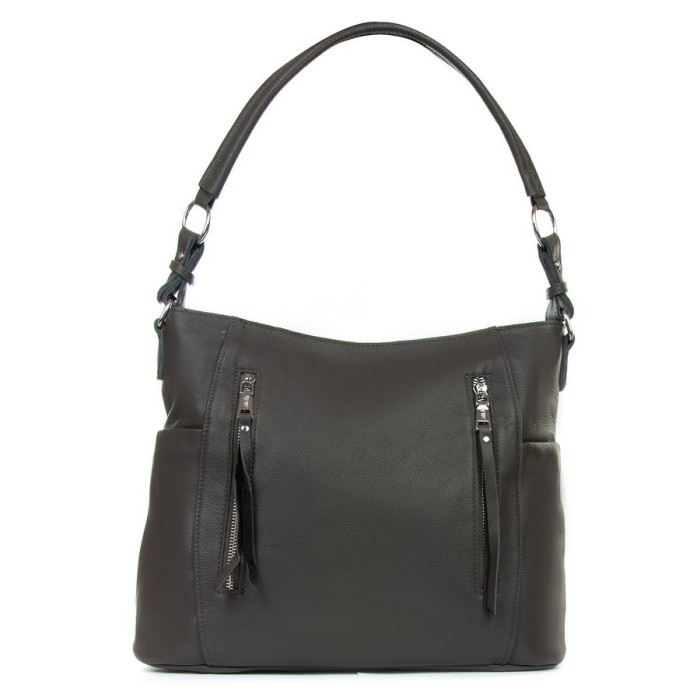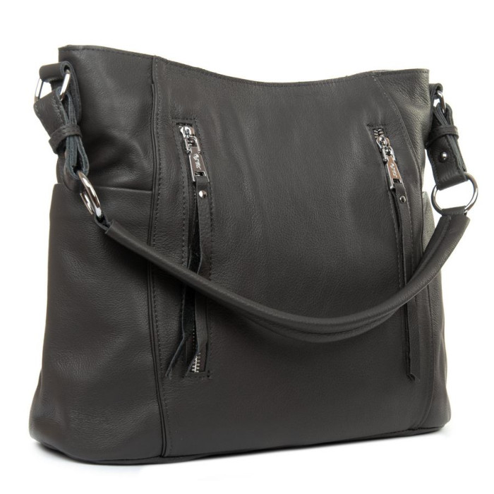Жіноча шкіряна сумка Alex Rai. Виготовлена із натуральної м'якої шкіри. Закривається на блискавку. Усередині знаходиться подвійне відділення, розділене кишенею-перегородкою на блискавці, відкрита кишеня та бічна кишеня на блискавці. Зовні сумки на фасаді та на звороті є великі кишені на блискавці. На торцях розташовані невеликі відкриті кишені. Ущільнене дно.