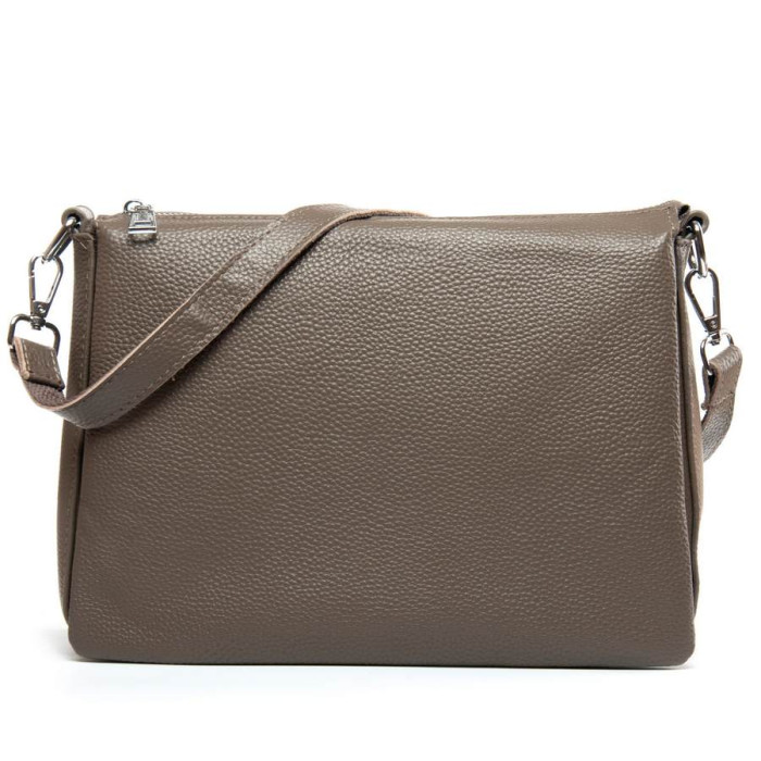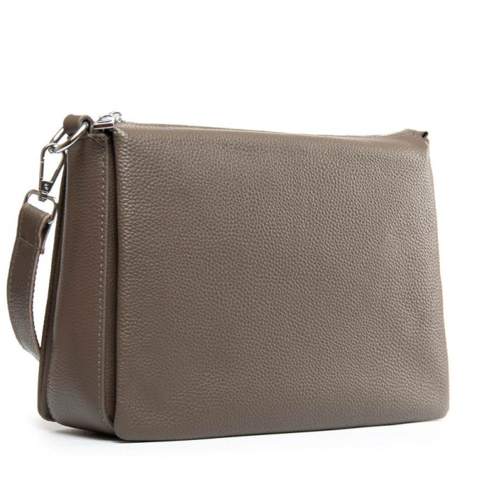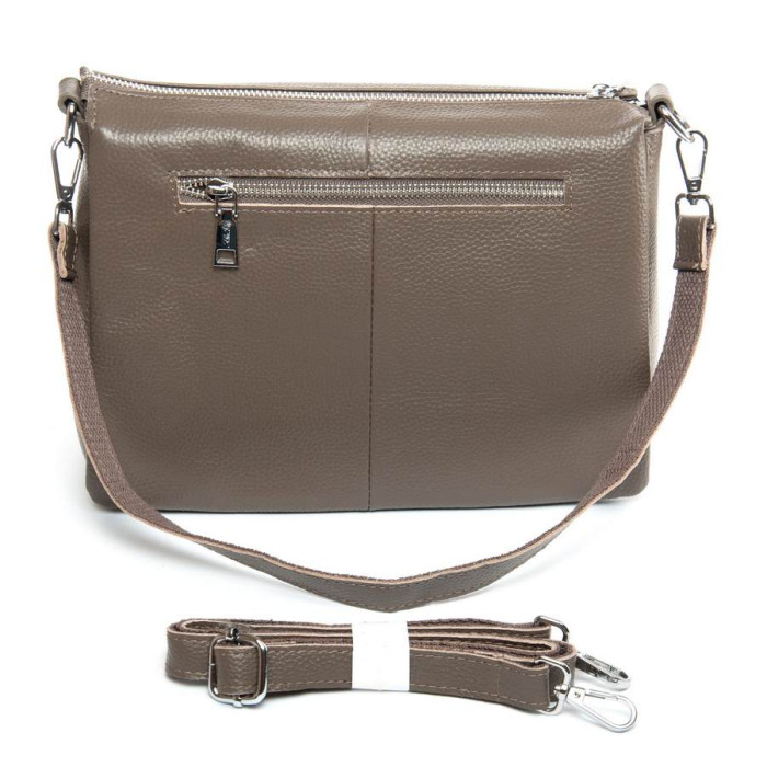 Виготовлена з натуральної м'якої шкіри. Закривається на блискавку. Всередині знаходяться три відділення, розділені кишенею-перегородкою. Середнє відділення додатково закривається на блискавку, а всередині знаходиться бічна відкрита кишеня і кишеня на блискавці. Зовні сумки на зворотному боці розташована кишеня на блискавці.