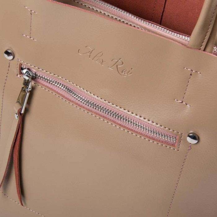 Жіноча сумка Alex Rai. Виготовлена з натуральної щільної шкіри. Закривається на блискавку. Всередині знаходиться подвійне відділення, розділене кишенею-перегородкою на блискавці, подвійна відкрита кишеня і кишеня на блискавці на внутрішніх стінках сумки. На фасаді і зворотному боці розташовані кишені на блискавці. Дно сумки з металевими ніжками. В комплекті регульований плечовий ремінь.