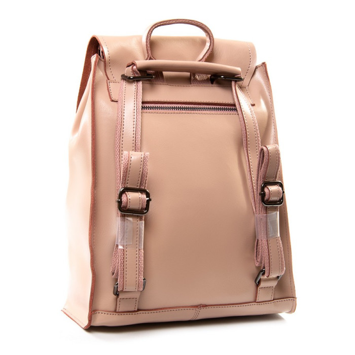Жіночий шкіряний рюкзак. Виготовлений із натуральної щільної шкіри. Можна носити на плечі на регульованому ремені. Під клапаном додатково закривається на блискавку. Усередині знаходиться основне і додаткове відділення, розділене кишенею-перегородкою на блискавці, відкрита кишеня і кишеня на блискавці. Зовні рюкзака на зворотному боці розташована кишеня на блискавці. Плечові лямки регулюються за довжиною.