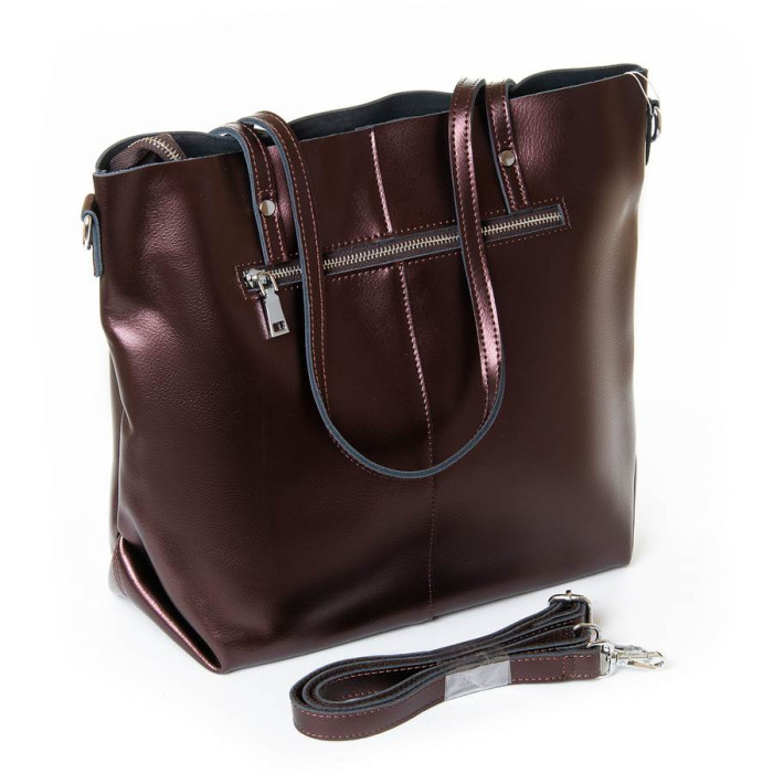 Жіноча сумка з натуральної шкіри. Закривається на блискавку. Усередині сумки подвійне відділення, розділене кишенею-перегородкою на блискавці, бічна кишеня на блискавці і відкрита подвійна кишеня. На зворотному боці сумки кишеня на блискавці. У комплекті регульований плечовий ремінь.