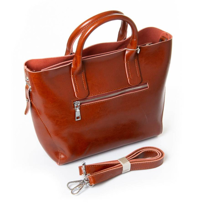 Жіноча сумка з натуральної шкіри. Закривається на блискавку. Усередині сумки подвійне відділення, розділене кишенею-перегородкою на блискавці, бічна кишеня на блискавці і відкрита подвійна кишеня. На зворотному боці сумки кишеня на блискавці. У комплекті регульований плечовий ремінь.