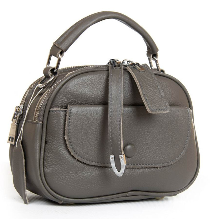 Жіноча шкіряна сумочка. М'яка шкіра. Два відділення, що закриваються на блискавку. На фасаді є велика кишеня під клапаном, а на звороті на блискавці.