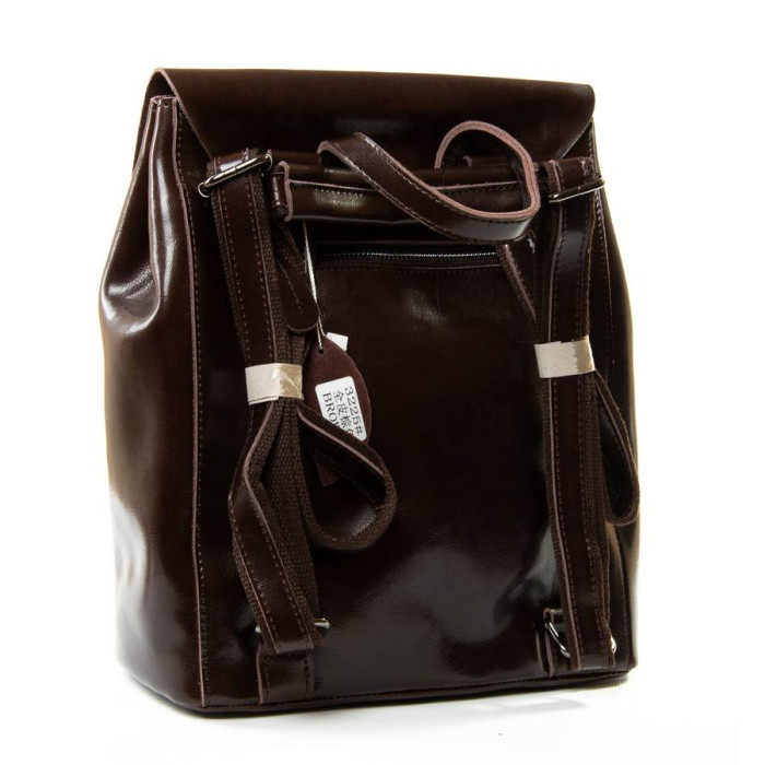 Жіночий шкіряний рюкзак. Виготовлений із натуральної щільної шкіри. Можна носити на плечі на регульованому ремені. Під клапаном додатково закривається на блискавку. Усередині знаходиться основне і додаткове відділення, розділене кишенею-перегородкою на блискавці, подвійна відкрита кишеня і кишеня на блискавці. Зовні на зворотному боці розташована кишеня на блискавці. Плечові лямки регулюються за довжиною.