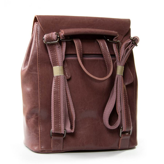 Жіночий шкіряний рюкзак. Виготовлений із натуральної щільної шкіри. Можна носити на плечі на регульованому ремені. Під клапаном додатково закривається на блискавку. Усередині знаходиться основне і додаткове відділення, розділене кишенею-перегородкою на блискавці, подвійна відкрита кишеня і кишеня на блискавці. Зовні на зворотному боці розташована кишеня на блискавці. Плечові лямки регулюються за довжиною.