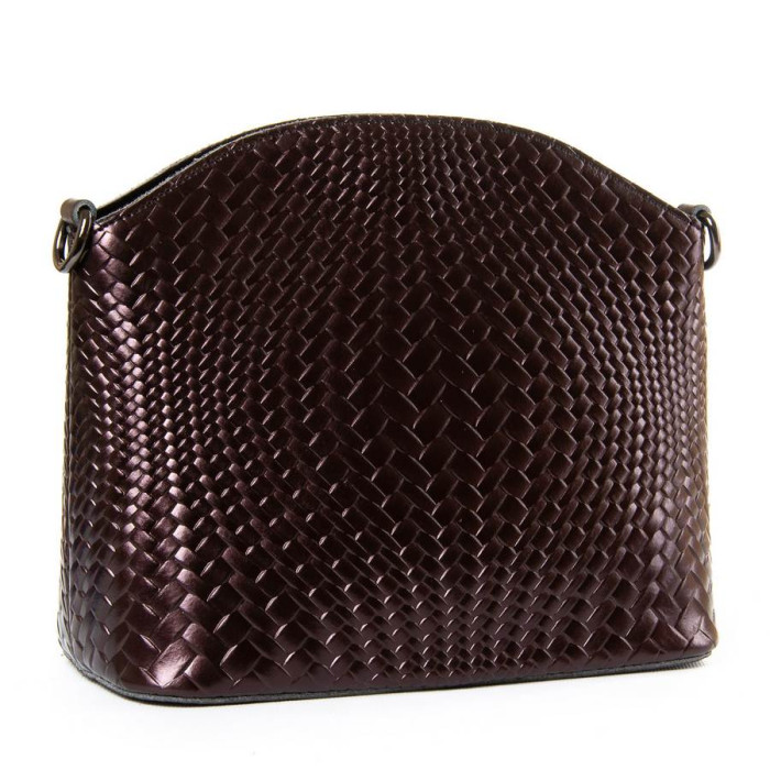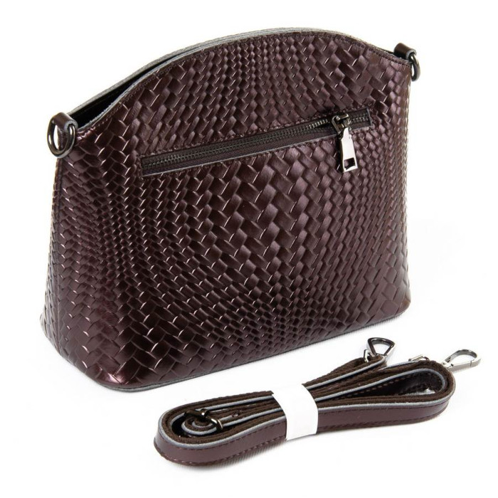 Жіноча сумка. Виготовлена із натуральної щільної шкіри. Закривається на блискавку. Усередині знаходиться подвійне відділення, розділене кишенею-перегородкою на блискавці, відкрита кишеня та бічна кишеня на блискавці. На звороті сумки є кишеня на блискавці. У комплекті регульований плечовий ремінь.