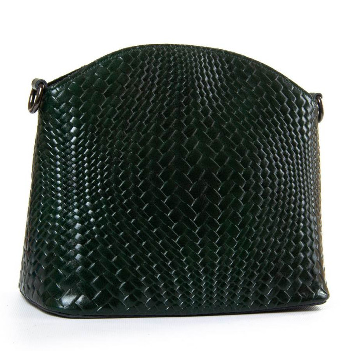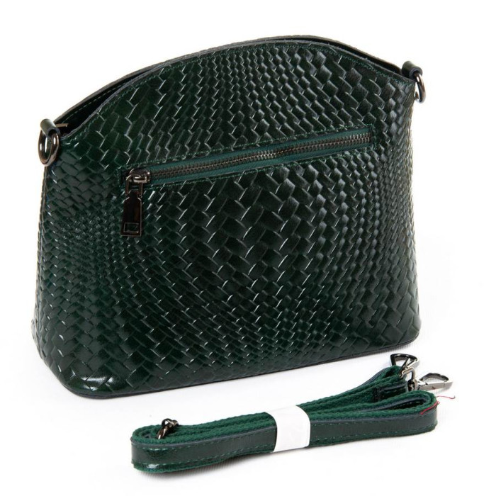Жіноча сумка. Виготовлена із натуральної щільної шкіри. Закривається на блискавку. Усередині знаходиться подвійне відділення, розділене кишенею-перегородкою на блискавці, відкрита кишеня та бічна кишеня на блискавці. На звороті сумки є кишеня на блискавці. У комплекті регульований плечовий ремінь.