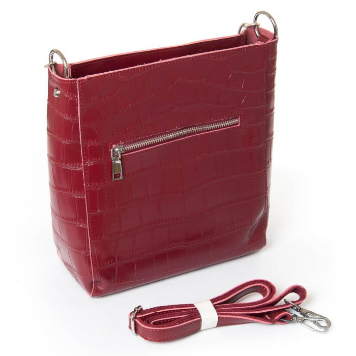 Жіноча шкіряна сумка. Виготовлена із натуральної щільної шкіри. Одне відділення закривається на блискавку. Усередині є відкрита бічна кишеня та кишеня на блискавці. На звороті знаходиться кишеня на блискавці. У комплекті регульований плечовий ремінь.