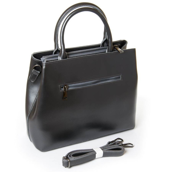 Жіноча шкіряна сумка. Виготовлена із натуральної щільної шкіри. Закривається на блискавку. Усередині відділення розділене кишенею-перегородкою на блискавці, також є відкрита кишеня та кишеня на блискавці. На фасаді та зворотному боці знаходяться кишені на блискавці. У комплекті регульований плечовий ремінь.