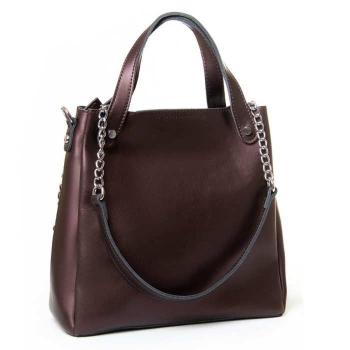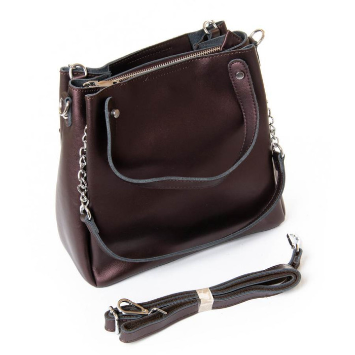Жіноча шкіряна сумочка. Виготовлена із натуральної щільної шкіри. Три відділення. Центральне закривається на блискавку, а бічні – на магнітну кнопку. Всередині центральне відділення розділене кишенею-перегородкою на блискавці, також є відкрита кишеня та кишеня на блискавці. У комплекті регульований плечовий ремінь.