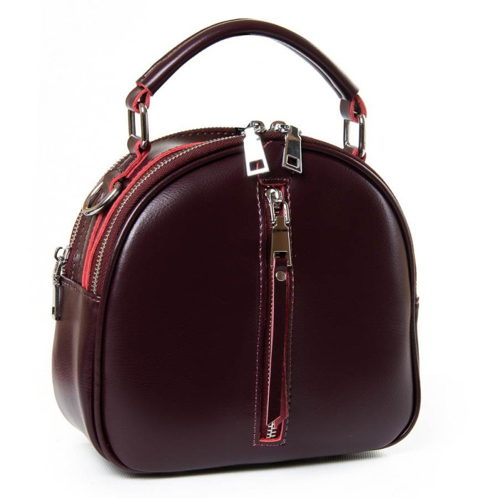 Жіноча шкіряна сумочка-рюкзак. Виготовлена із натуральної щільної шкіри. Можна носити як рюкзак або на плечі на регульованому ремені. Два відділення, закриваються на блискавку. Усередині відділень є подвійний відкритий кишеню і кишеню на блискавки. На фасаді і зворотному боці знаходяться кишені на блискавці. Плечові лямки регулюються по довжині.