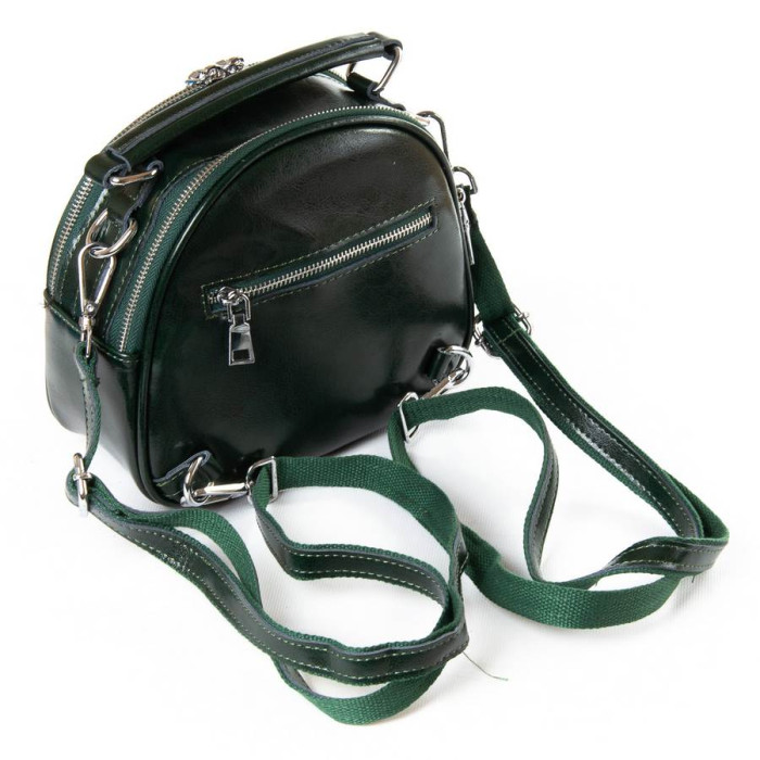 Жіноча шкіряна сумочка-рюкзак. Виготовлена із натуральної щільної шкіри. Можна носити як рюкзак або на плечі на регульованому ремені. Два відділення, закриваються на блискавку. Усередині відділень є подвійний відкритий кишеню і кишеню на блискавки. На фасаді і зворотному боці знаходяться кишені на блискавці. Плечові лямки регулюються по довжині.