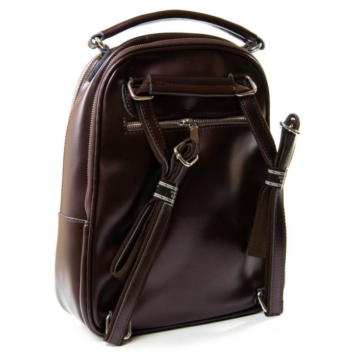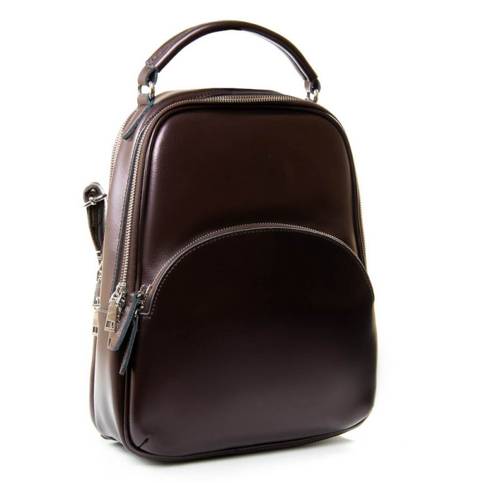 Жіночий шкіряний рюкзак. Виготовлений зі щільної натуральної шкіри. Два відділення, закриваються на блискавку. Усередині відділень є подвійна відкрита кишеня і кишеня на блискавці. На фасаді і зворотному боці знаходяться кишені на блискавці. Плечові лямки регулюються за довжиною.