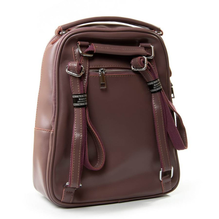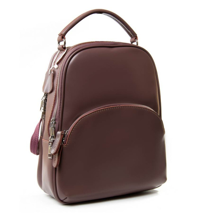 Жіночий шкіряний рюкзак. Виготовлений зі щільної натуральної шкіри. Два відділення, закриваються на блискавку. Усередині відділень є подвійна відкрита кишеня і кишеня на блискавці. На фасаді і зворотному боці знаходяться кишені на блискавці. Плечові лямки регулюються за довжиною.