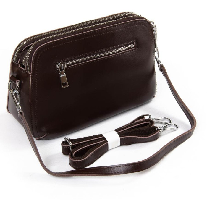Жіноча сумочка-клатч. Виготовлена з натуральної м'якої шкіри. Три відділення, закриваються на блискавці. Усередині центрального відділення знаходиться подвійна відкрита кишеня і кишеня на блискавці. На зворотному боці є кишеня на блискавці. У комплекті регульований плечовий ремінь і знімна ручка.